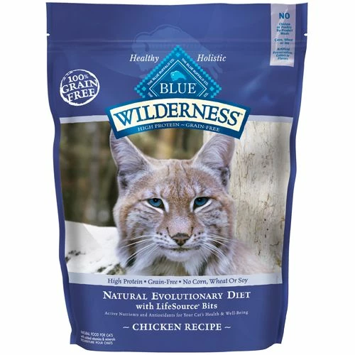 Blue Wilderness Chicken Recipe Adult Cat Food is inspired by the diet of the lynx, a tireless hunter and wild relative of our domesticated feline friends, protein-rich BLUE Wilderness contains a higher concentration of the delicious chicken you know she?ll love, plus other natural quality ingredients and features: Delicious, protein-rich, Deboned Chicken, sweet potatoes that provide healthy complex carbohydrates, cranberries, blueberries and carrots that support antioxidant enrichment, NO grains or glutens, NO chicken (or poultry) by-product meals, and NO artificial preservatives and NO corn, wheat or soy. This cat food uses BLUE LifeSource Bits are a precise blend of antioxidants, vitamins and minerals selected by holistic veterinarians and animal nutritionists that support: Immune system health, Life stage requirements, and Healthy oxidative balance. Blue Wilderness Cat Food uses high-quality protein from Deboned Chicken, plus Chicken Meal and Turkey Meal helps build strong muscles. There is an optimal balance of Omega 3 & 6 Fatty Acids helps to promote a shiny coat and healthy skin. Only high-quality protein and natural sources of fiber is used to help provide optimal nutrient absorption and digestive health. The carefully balanced calories from proteins and fat help to maintain an ideal, healthy body weight. Essential vitamins, chelated minerals and important antioxidants help support the immune system. Taurine is an essential amino acid that cats require to help maintain heart and eye health.