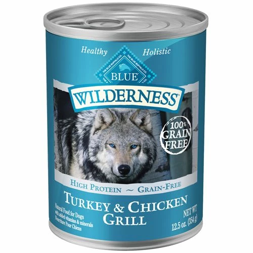 BLUE Wilderness Turkey and Chicken Grill Adult Dog Canned Food is inspired by the diet of the wolf, BLUE Wilderness is a high-protein, low-carbohydrate food that will provide your dog with a higher concentration of the turkey and chicken he loves. BLUE Wilderness is made with the finest natural ingredients, including generous amounts of tasty and nutritious turkey and chicken. And Wilderness contains no chicken or poultry by-product meals, artificial preservatives, corn, wheat or soy. Complete and balanced, BLUE Wilderness is also a sensible alternative to less convenient raw diets, which often require additional supplementation to be nutritionally complete.