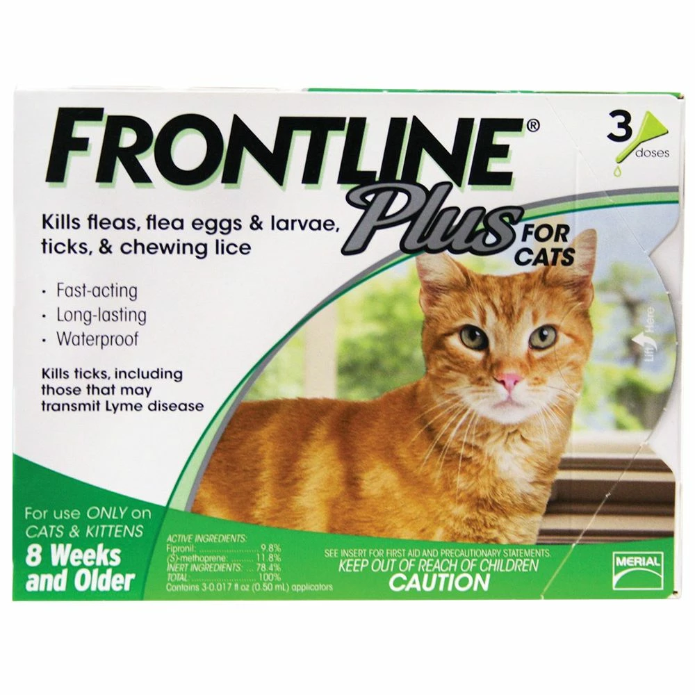Frontline Plus Flea & Tick for Cats 8 weeks and older effectively targets all stages of fleas. Fipronil collects in the oils of the skin and hair follicles and continues to be released from hair follicles onto the skin and coat resulting in long-lasting activity against fleas and ticks. By effectively stopping the development of new fleas Frontline Plus completely breaks the flea life cycle.