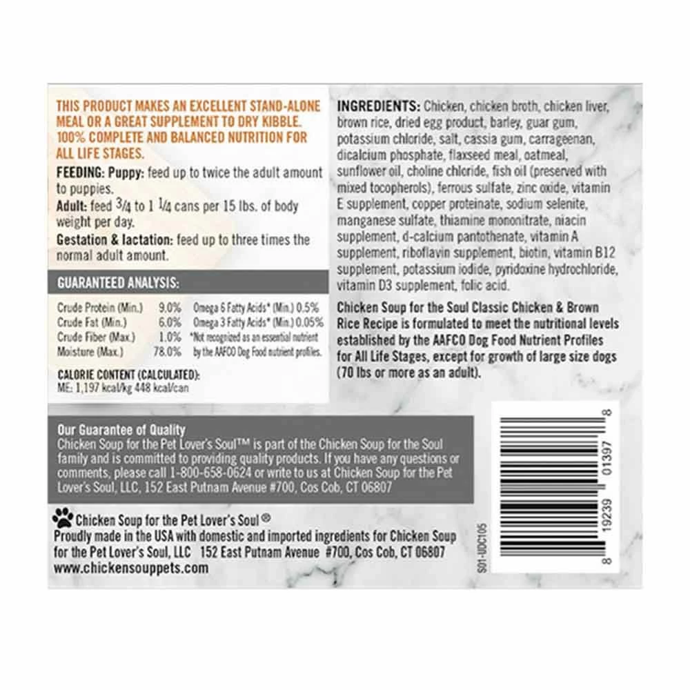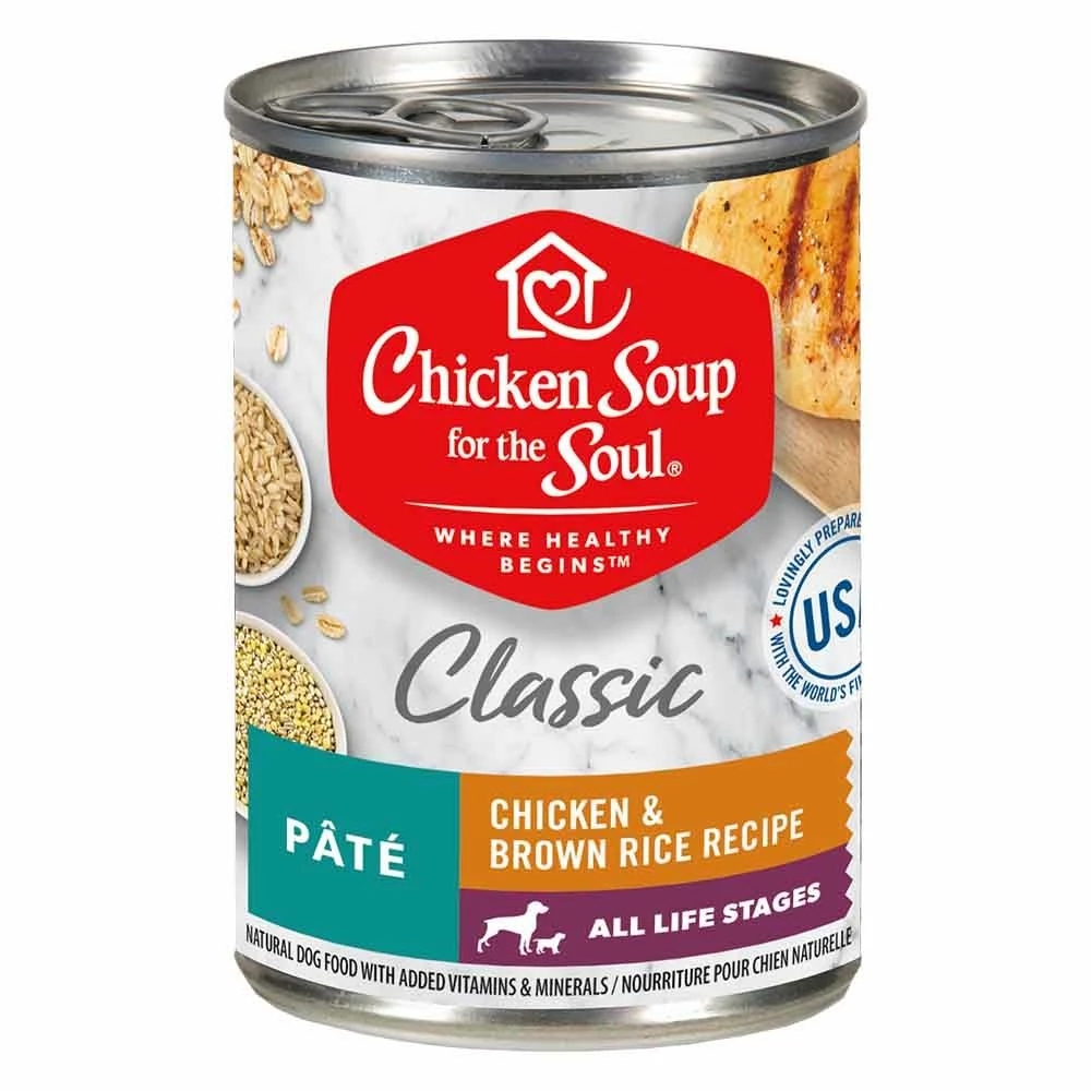 Chicken Soup for the Soul Classic Wet Dog Food Chicken & Brown Rice Recipe Pâté is made from the finest, simplest ingredients. It provides a nutritious, well-balanced base for a happy healthy wholesome life for your dog. The #1 ingredient is real chicken. This canned dog food contains no by-product meals, no wheat, corn, soy or artificial preservatives of flavors. Omega fatty acids help support skin & coat. This product makes an excellent stand-alone meal or a great supplement to dry kibble. It is 100% complete and balanced nutrition for all stages.