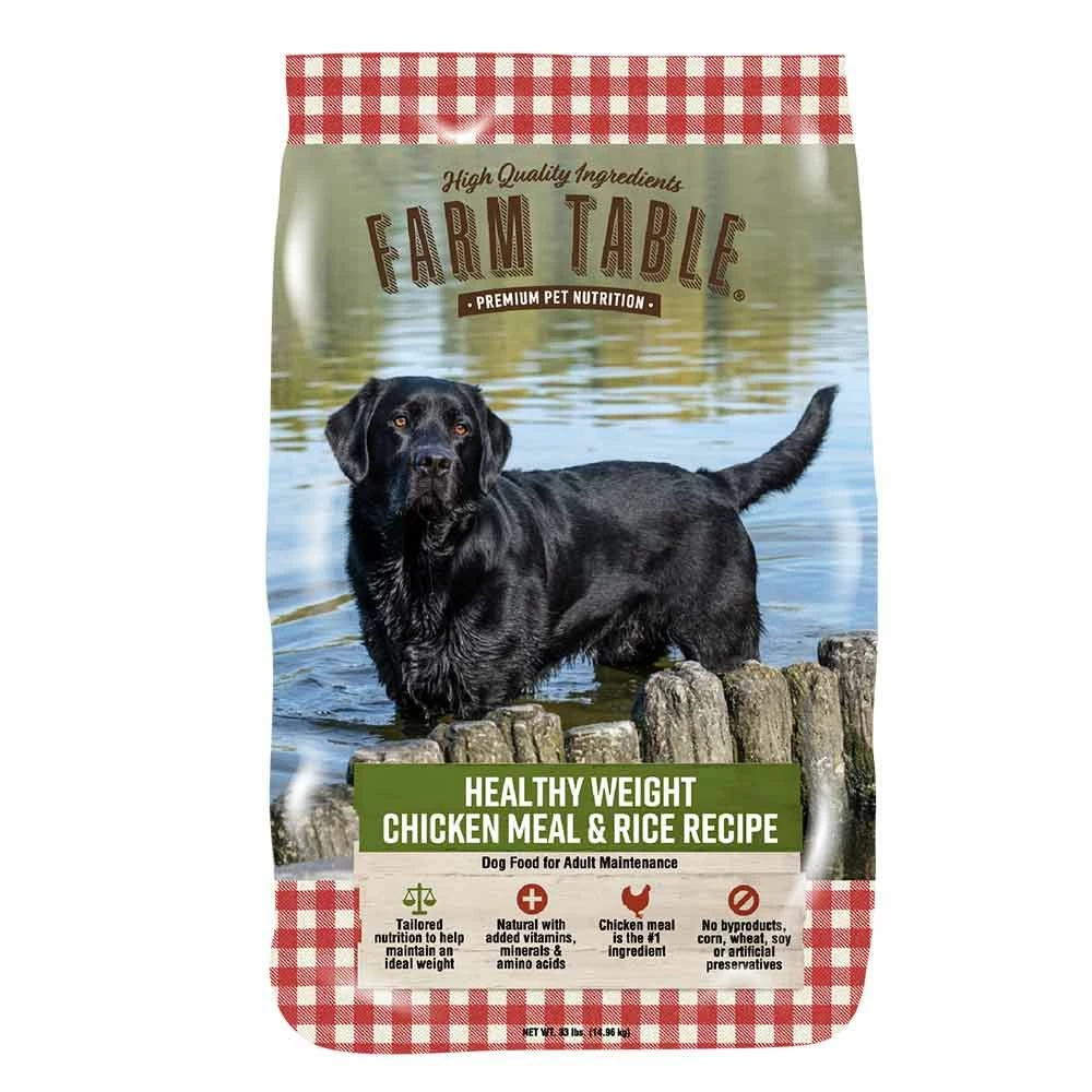 Farm Table® Healthy Weight Chicken Meal & Rice Recipe Adult Dog Food is tailored nutrition to help maintain an ideal weight. It is made with real ingredients, like high-quality protein, vegetables and wholesome ingredients, provide sustained energy to your pet's work and play. Balanced fatty acids keep your pet's skin and coat healthy. Natural antioxidants encourage a healthy digestive tract, the basis for an effective immune system. Proteins and minerals fuel their outdoor adventures and help maintain flexibility and mobility. It is made with no artificial colors, flavors or preservatives, corn, wheat or soy.