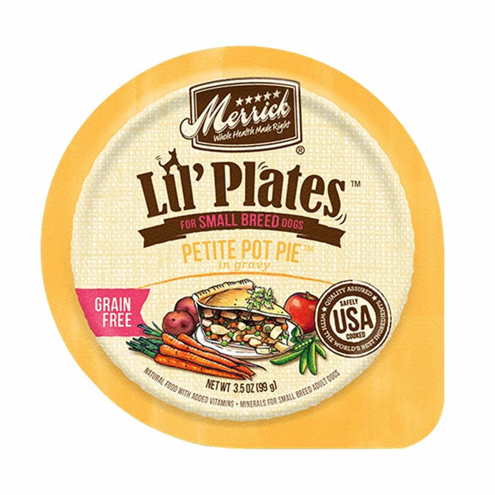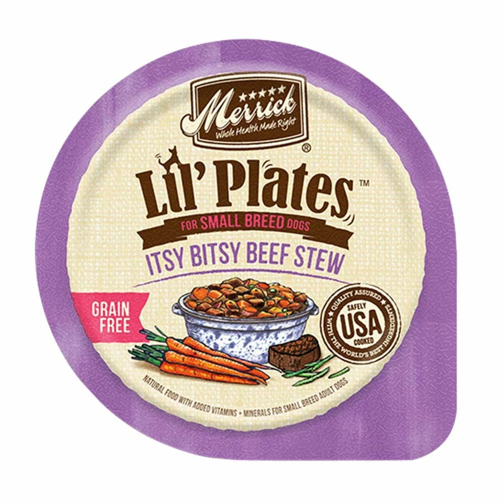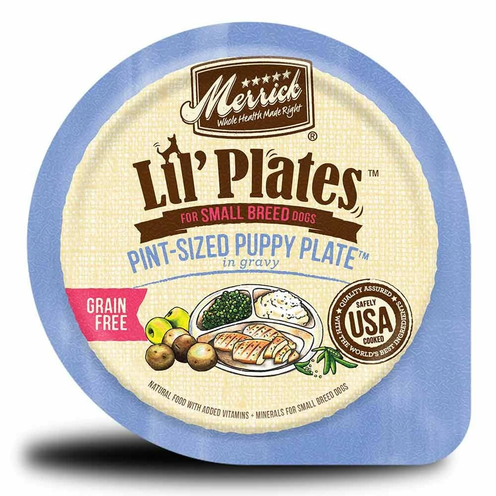 Merrick Lil' Plates Grain Free Dog Food features a taste and texture your tiny pup will love. The easy-open trays pack incredible nutrition into convenient, single-servings designed to offer the right sized portion & nutrition for smaller breeds. Deboned protein is always the first ingredient. This high quality protein helps build and maintain healthy muscle tissue and energy levels. Succulent pieces of real meat in gravy provide added moisture and flavor to your dog’s diet. The grain free formula with sweet potatoes, peas, apples and blueberries is for essential vitamins and minerals. Complete and balanced nutrition with omega 3 fatty acids that help your pup maintain their healthy skin and coat. Gluten free meal includes probiotics and prebiotic fiber for healthy digestion and glucosamine and chondroitin for healthy joints. All Merrick recipes are crafted in our Hereford, TX kitchen and cooked in the USA, in facilities that uphold strict FDA guidelines.