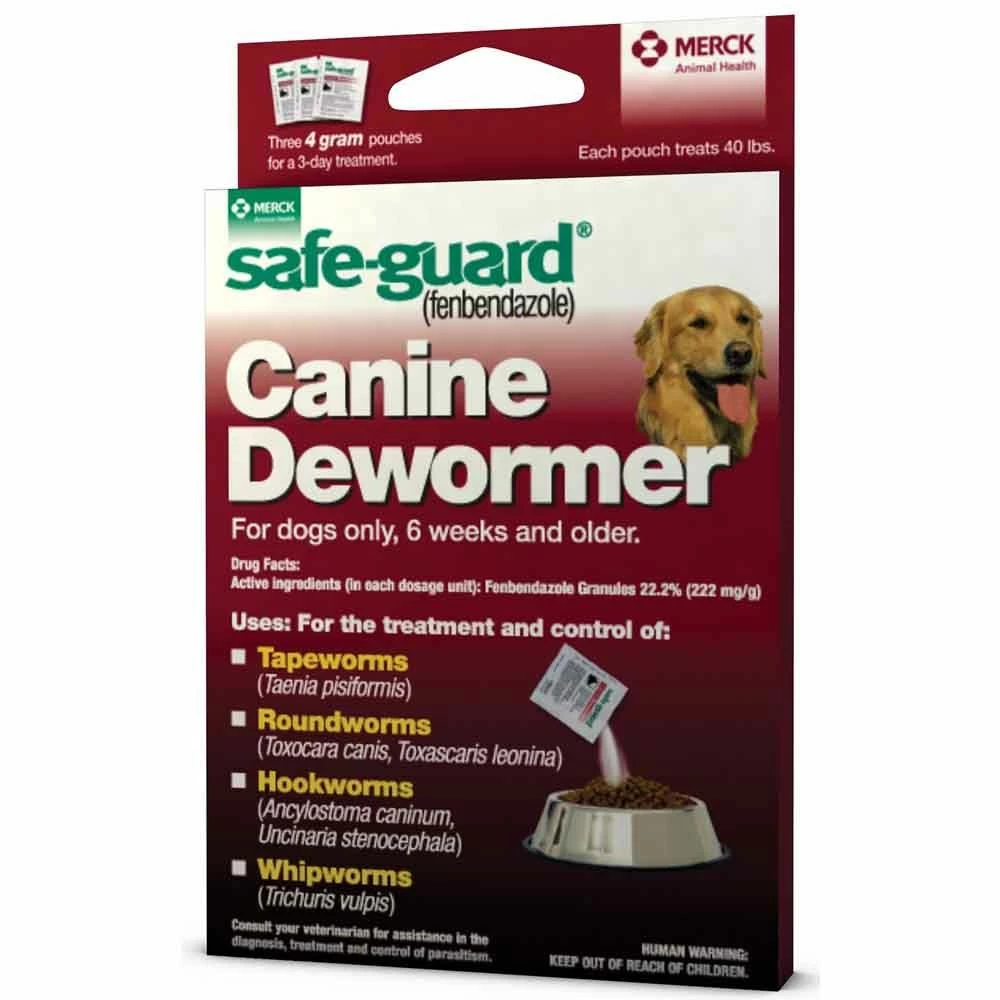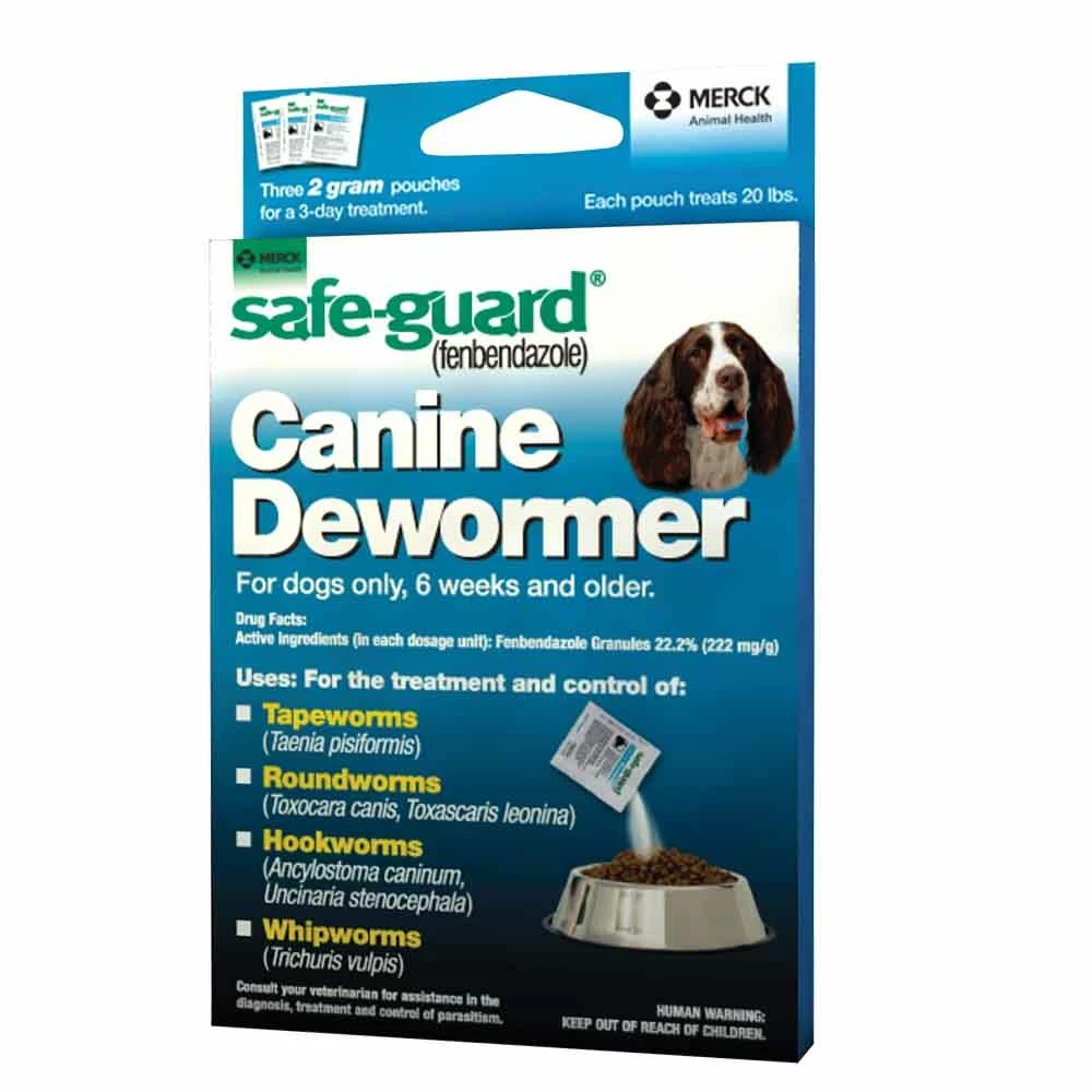 Safe-Guard® Canine Dewormer treats 6 different intestinal worm types common to outdoor dogs with only one compound, fenbendazole. So you can treat more with less, minimizing your dog’s chemical exposure. It safe for puppies and pregnant dogs and has no known drug interactions. Dogs readily accept SAFE-GUARD Canine Granules. When mixed in food, dogs usually eat it without fuss, which helps to ensure they receive a complete and proper dosing. It is for the tretment and control of Roundworms (Toxocara canis, Toxascaris leonina), Hookworms (Ancylostoma caninum, Uncinaria stenocephala), Whipworms (Trichuris vulpis), and Tapeworms (Taenia pisiformis).