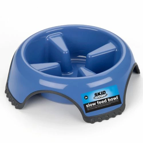 Skid Stop Slow Feed Pet Bowl is a heavy duty plastic bowl designed to slow rapid eating, promote regular digestion, and prevent bloat and discomfort for large pets. It is bacateria reistant. The Skid Stop bowls were designed with a rubbery base to prevent the bowl from sliding or moving around on the floor while the pet is eating. The rubber bottom creates a firm grip on slippery surfaces to prevent the bowl from moving or tipping, this also helps to prevents spills.