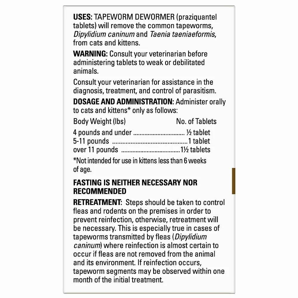 Tapeworms in cats are a common concern, and Bayer’s Tapeworm Dewormer medicine is an effective way to remove common tapeworms from cats. Tapeworm Deowormer tables are sized for easy oral administration to either adult cats or kittens. They will remove the common tapeworms, Dipylidium caninum and Taenia taeniaeformis, from cats and kittens. It may be give direct in the mouth or crumbled and mixed with food. Isolated incident of either salivation or diarrhea have been reported following treatment, but were considered non-significant. If these signs are observed and they persist, consult your veterinarian. Luckily, one treatment with Tapeworm Dewormer (praziquantel tablets) for cats should be adequate to clear out the tapeworms. However, steps should be taken to treat and prevent fleas on the cat (and other pets in the home) and remove rodents around the home or premises in order to prevent reinfection; otherwise, retreatment will be needed.