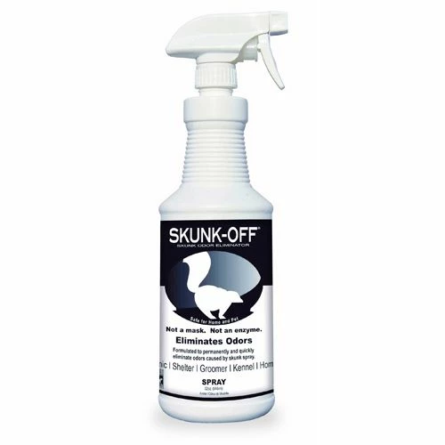 Skunk-Off Skunk Odor Eliminator Spray stops skunk odor instantly and permanently on contact. It removes all traces of skunk spray from dogs, other pets, people, cloths, cars, homes, anybody or anything a skunk has sprayed or anything a skunk-sprayed animal has rubbed against. This a safe product that will not damage or irritate sensitive tissue of eyes, ears or nose.