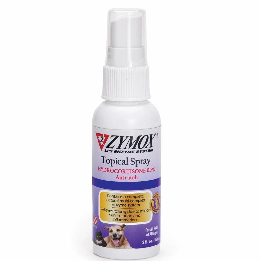 ZYMOX® Topical Spray with 0.5% Hydrocortisone Promotes healthy skin and provides relief from itching and hot spots caused by inflammation, dermatitis, and other minor skin irritations. ZYMOX Topical Spray features the patented LP3 Enzyme System which blends a concentrated combination of protein and enzymes plus skin soothing aloe vera and 0.5% hydrocortisone for itch relief. The Spray is ideal for areas away from the face.