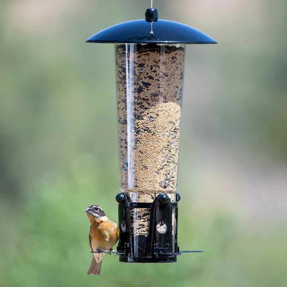 Offering maximum protection against squirrels and maximum comfort for your favorite birds, the Perky-Pet® Squirrel-Be-Gone® Max Bird Feeder with Flexports® is the feeder you’ve been searching for. To offer defense against squirrels, this feeder offers a Sure-Lock™ cap and a weight-activated Seed Shield™ so squirrels can’t gain access to the seed supply. In addition to its squirrel proof features, the Squirrel-Be-Gone® Max is also a favorite of birds. It also includes four feeding stations with our patented Flexports®, which offer 5-in-1 benefits for birds and you. With its rustic powder coating, this feeder will make a charming addition in any backyard setting.