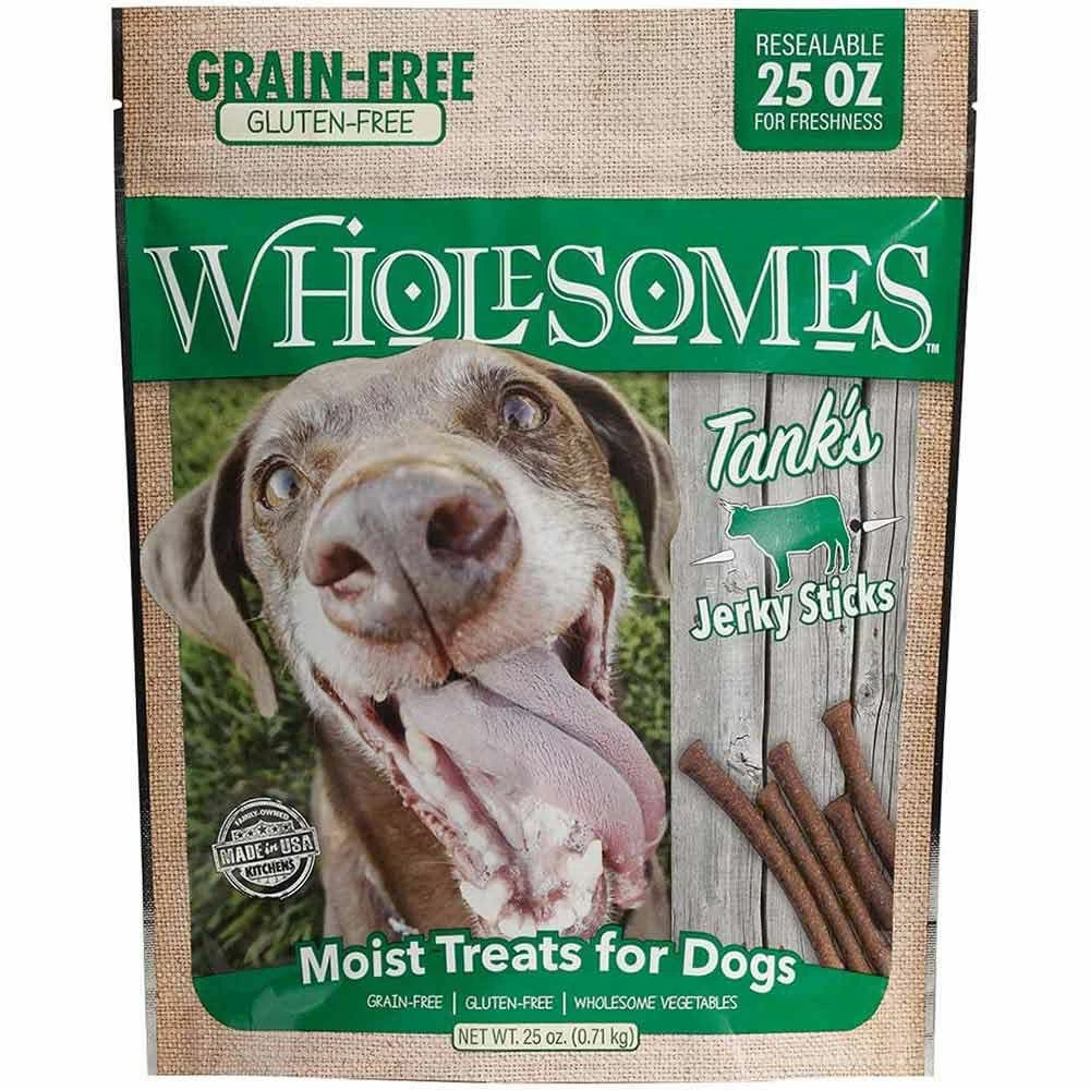 Merrick Wholesomes Tanks Jerky Strips Dog Treats are grain free, gluten free tender jerky sticks. When the bag opens, your dog will smell the US farm-raised beef and vegetables. He doesn’t realize there’s rich nutrition packed into each and every bite. High-quality proteins help build and maintain muscle function and help provide him with the energy he needs in a good game of fetch.