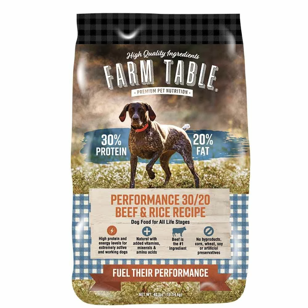 Farm Table® Performance 30/20 Beef & Rice Recipe Dog Food is made with high protein and energy levels for extremely active and working dogs. The balanced omega 6 and omega 3 fatty acids is for healthy skin and coat. It is natural with added vitamins, minerals and amino acids and has natural prebiotics and probiotics. 82% of protein is from animal proteins sources, with beef as the #1 ingredient. the right balance of protein and fac is for extremely active and working dogs. There are no artificial colors, flavors or preservatives. Farm Table® Performance 30/20 is made with no corn, wheat, soy or byproducts.