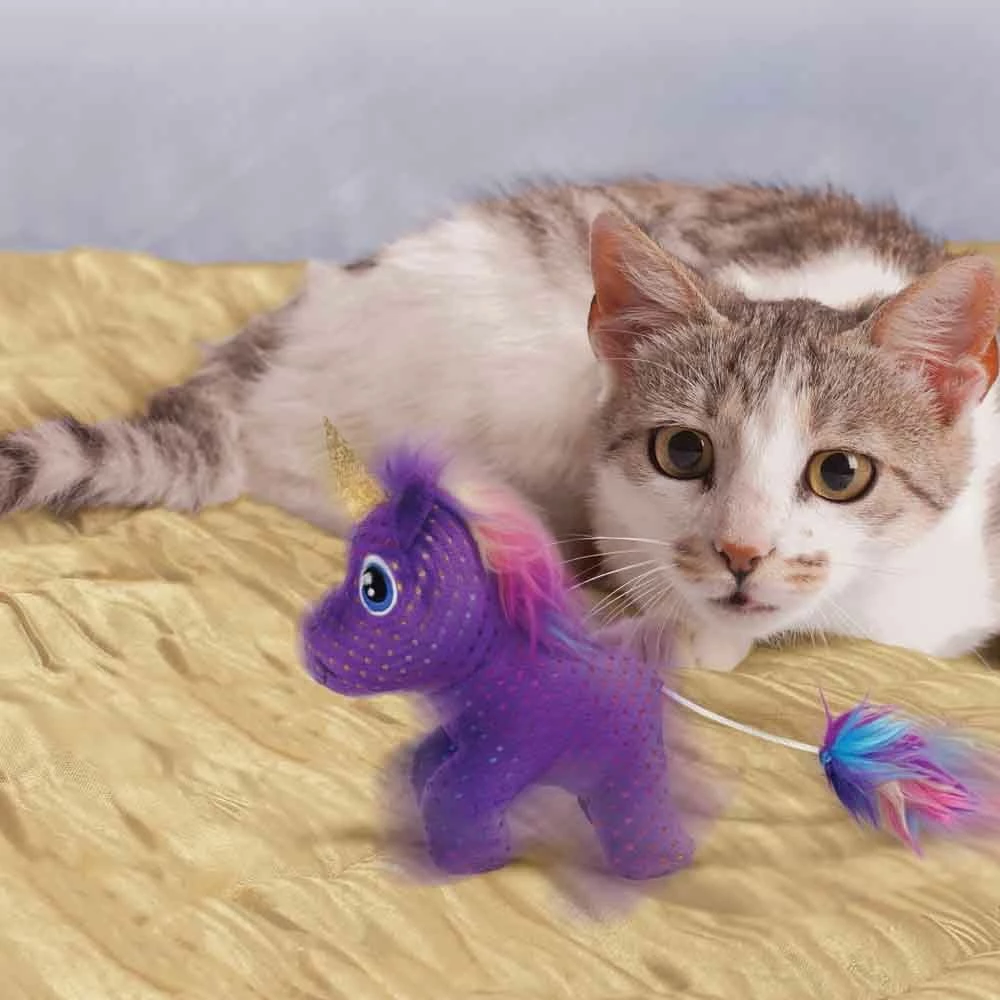 The KONG Enchanted Buzzy toy lures cats with an irresistible buzzing motion that engages natural instincts. Buzzing and spinning begin when the unicorn’s tail is pulled, activating a cat’s natural catch and capture play desires. Extending the fun are crinkle sounds, sparkly colors and KONG North American Premium Catnip, all adding up to keeping kitty’s occupied for some magical playtime fun.