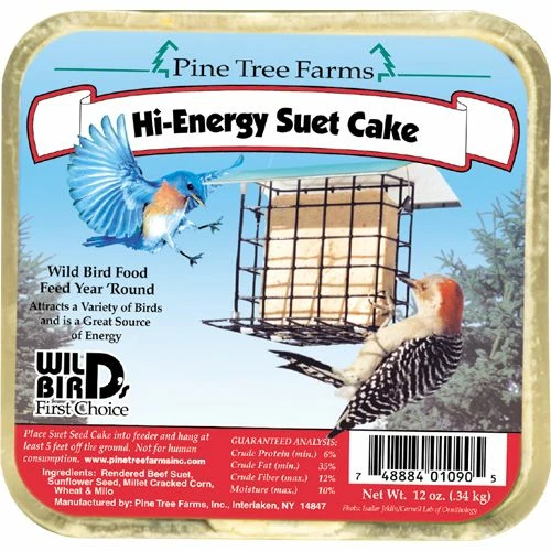 Pine Tree Farms Hi Energy Suet is a suet cake made with top quality grains to attract a large variety of birds. Excellent source of energy. Made with Beef Suet, Sunflower Seed, Millet, Cracked Corn, Peanuts, Cashews. The standard product of suets. 12 oz.