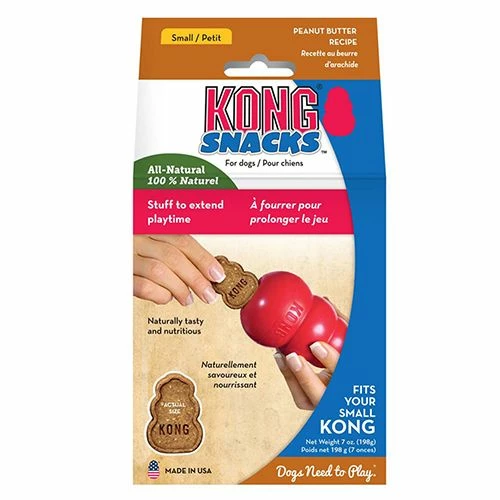 KONG® Peanut Butter Snacks are made with delicious flavor for a biscuit that is delightful for dogs. Made in the USA, these high-quality treats are all-natural and do not contain wheat, corn or soy giving them an irresistible flavor that is great for any treating moment. This smaller size is specially shaped and sized to fit your dog's small KONG® rubber toy for extended play. Ideal for any treating or training occasion. All-Natural.