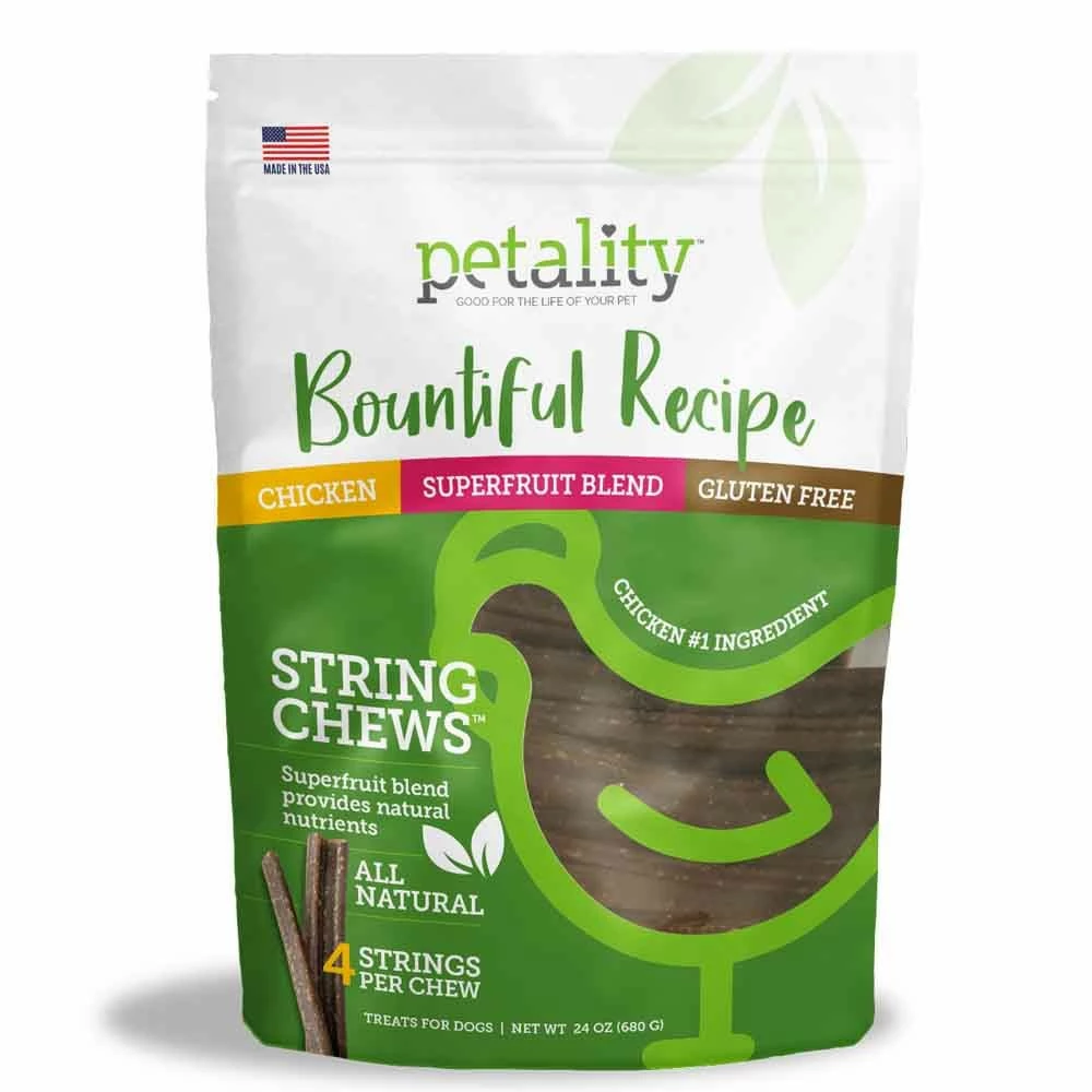 Petality Bountiful Recipe String Chews are all natural with delicious real roasted chicken as # ingredient and a bountiful superfruit blend (cherries, blueberries, blackberries, cranberries). With no wheat, no corn, no soy and no artificial preservatives or ingredients, dogs love the chewy goodness and pet parents love that each natural treat can be pulled apart providing four individual treating opportunities. Gluten Free and made in the USA. Let your dog savor these chicken & berry treats, one delicious string at a time. Good for the live of your pet.