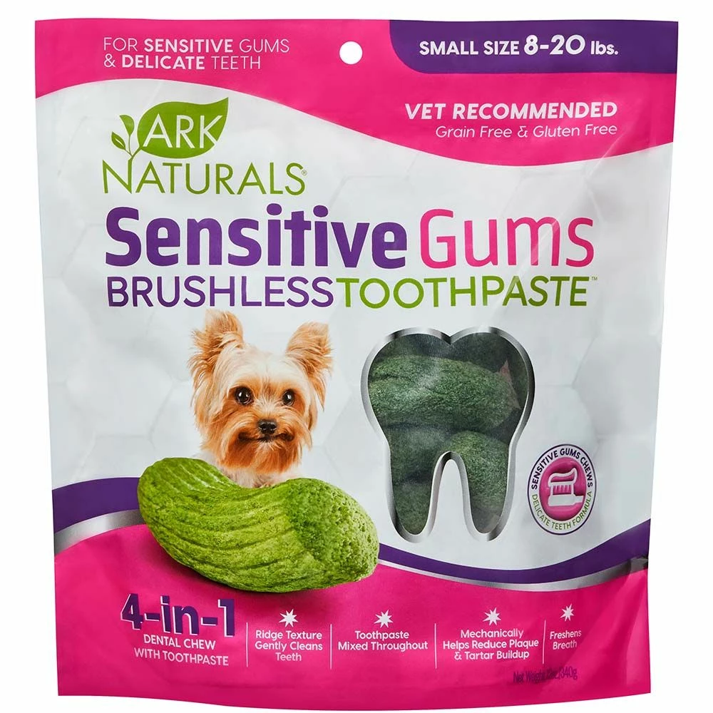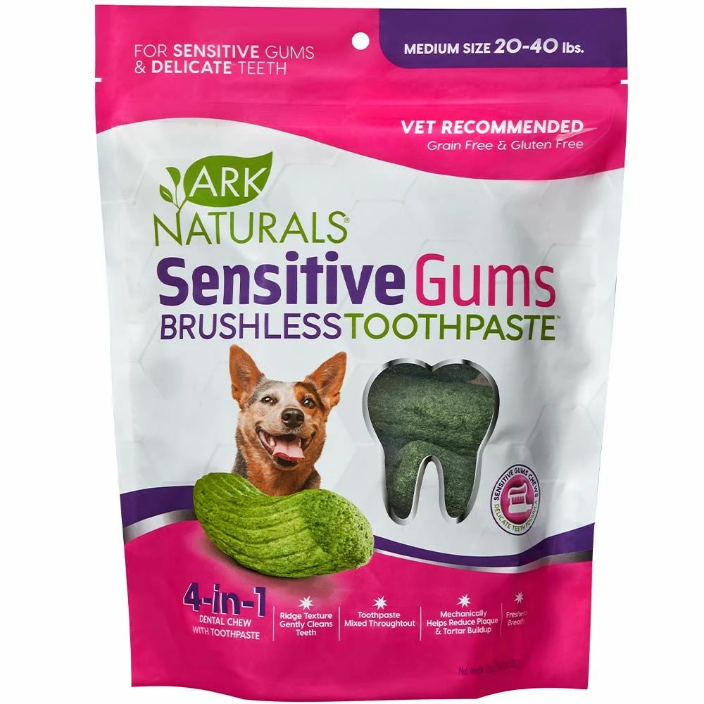 Our vet recommended ARK Naturals Sensitive Gums Brushless Toothpaste-Dog is a 4-in-1 dog dental chews are cesigned for sensitive or bleeding gums, these chews have a delicate consistency that is crunchy and airy to be gentle on your furry friend. The toothpaste center has active ingredients mixed throughout that help fight plaque and tartar. These chews also naturally freshen breath with active ingredients spearmint, cinnamon, clove and alfalfa. If your dog has trouble chewing harder treats, consider Ark Naturals Sensitive Gums Brushless Toothpaste 4-in-1 Dental Chews