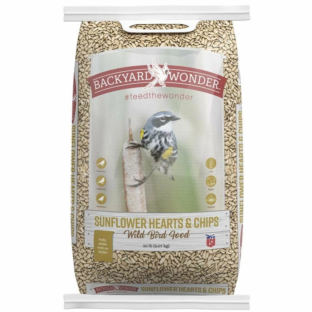 Backyard Wonder® Sunflower Hearts & Chips Wild Bird Food is fully edible with no shells. This highly nutritious treat attracts backyard favorites like goldfinches, nuthatches, and more. The shells are removed for a no-waste food. It is great for year round feeding. Place the feeder near trees or shrubs. offer water for birds to drink. And it's all made with care right here in the USA.#html-body [data-pb-style="6216044808200"]{justify-content: flex-start; display: flex; flex-direction: column; background-position: left top; background-size: cover; background-repeat: no-repeat; background-attachment: scroll; border-style: none; border-width: 1px; border-radius: 0px; margin: 0px 0px 10px; padding: 10px;}#html-body [data-pb-style="6216044808221"]{border-style: none; border-width: 1px; border-radius: 0px; margin: 0px; padding: 0px;}