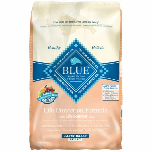 Blue Buffalo Life Protection Formula Chicken & Rice Large Breed Puppy Food formulated with ingredients chosen specifically to help address their special needs with high-quality protein chicken being the first ingredient. High-quality protein helps support muscle growth while calcium & phosphorus helps support bone development and DHA helps cognitive development. Vitamins and chelated minerals help support immune strength and fruits and veggies help support free radical fighters. The high-quality protein also provides them with daily essential amino acids. Hearty whole grains like brown rice, barley and oats supply the complex carbohydrates that your puppy needs for energy. Whole carrots, sweet potatoes and peas are three of the nutrient-rich vegetables that your puppy will get in every bite of BLUE. BLUE Life Protection Formula dog foods feature LifeSource Bits that have been enhanced with a Super 7 package of powerful antioxidant-rich ingredients. The ingredients in LifeSource Bits help support; immune system health, life stage requirement and healthy oxidative balance. And LifeSource Bits are cold-formed to help retain the potency of their ingredients. Other brands process their foods with heat up to 350°, which can degrade the potency of vitamins, antioxidants and nutrients by up to 75%.