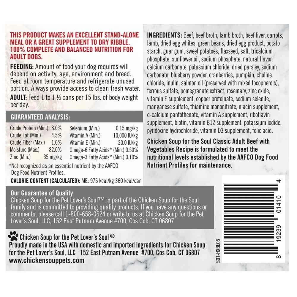 Chicken Soup for the Soul Classic Wet Dog Food Beef with Vegetables Recipe Cuts I Gravy #1 ingredient is real beef. This canned dog food contains no by-product meals, no wheat, corn, soy or artificial preservatives of flavors. It is made from the finest, simplest ingredients, our food provides a nutritious, well-balanced base for a happy, healthy wholesome life. Lovingly prepared in the USA with the world's finest ingredients.