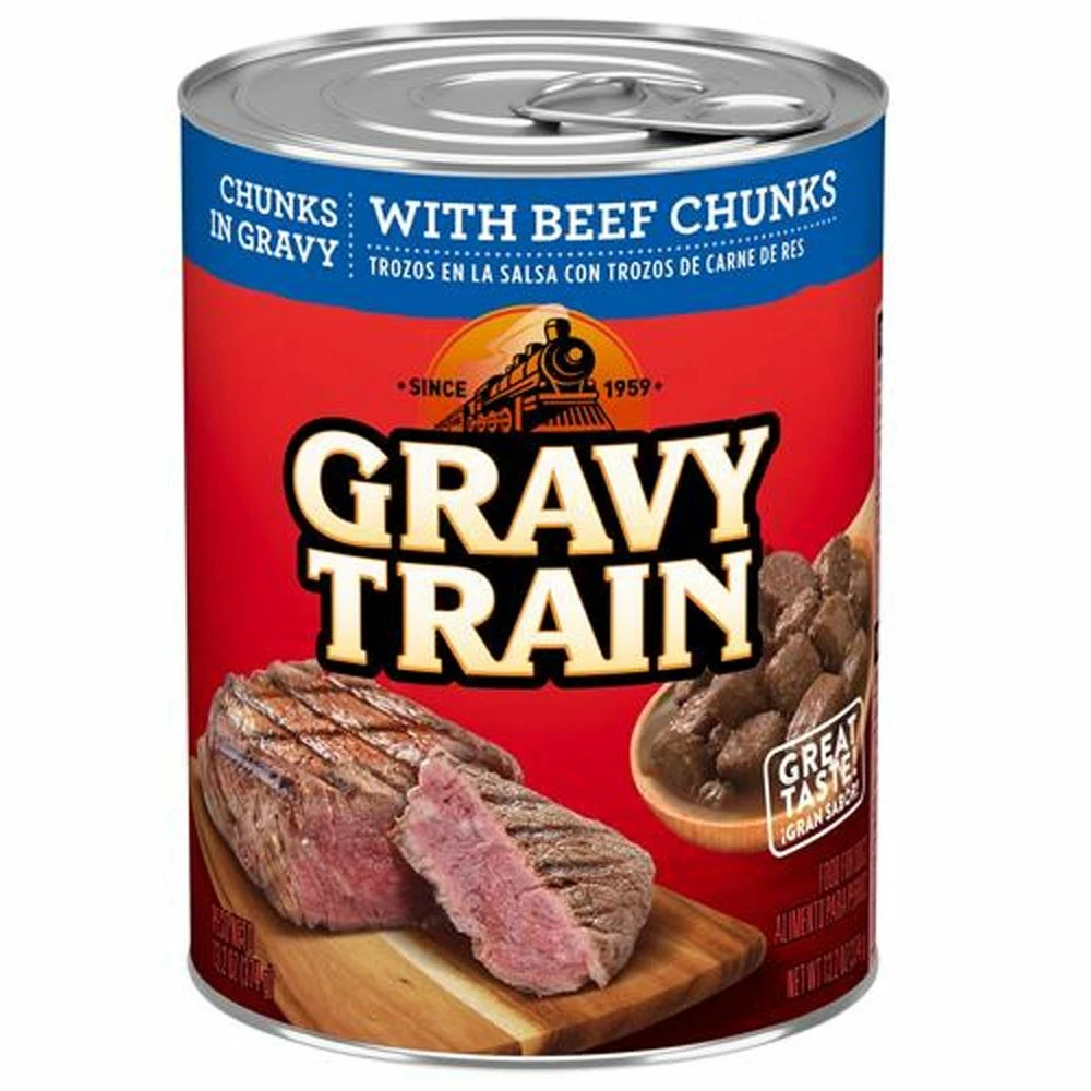 Dogs can’t resist the meaty flavors of Gravy Train's wet food featuring tasty flavored chunks of meat in savory gravy. This canned dog food is full of more than irresistible flavor—it also provides 100% complete and balanced nutrition for adult dogs. Just open a can with the easy pull-tab lid and watch your dog run full steam ahead for their food dish.