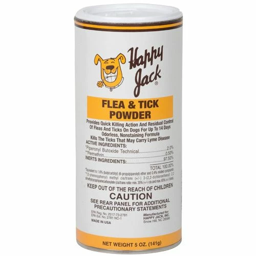 Happy Jack Flea and Tick Powder is odorless, non-staining and very effective against the ticks that may cause Lyme Disease. Flea and Tick Powder may also be used to dust the bedding, kennel, sleeping quarters, carpeting and furniture used by infested animals on a regular basis.