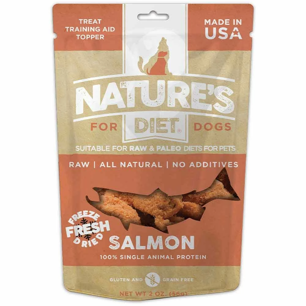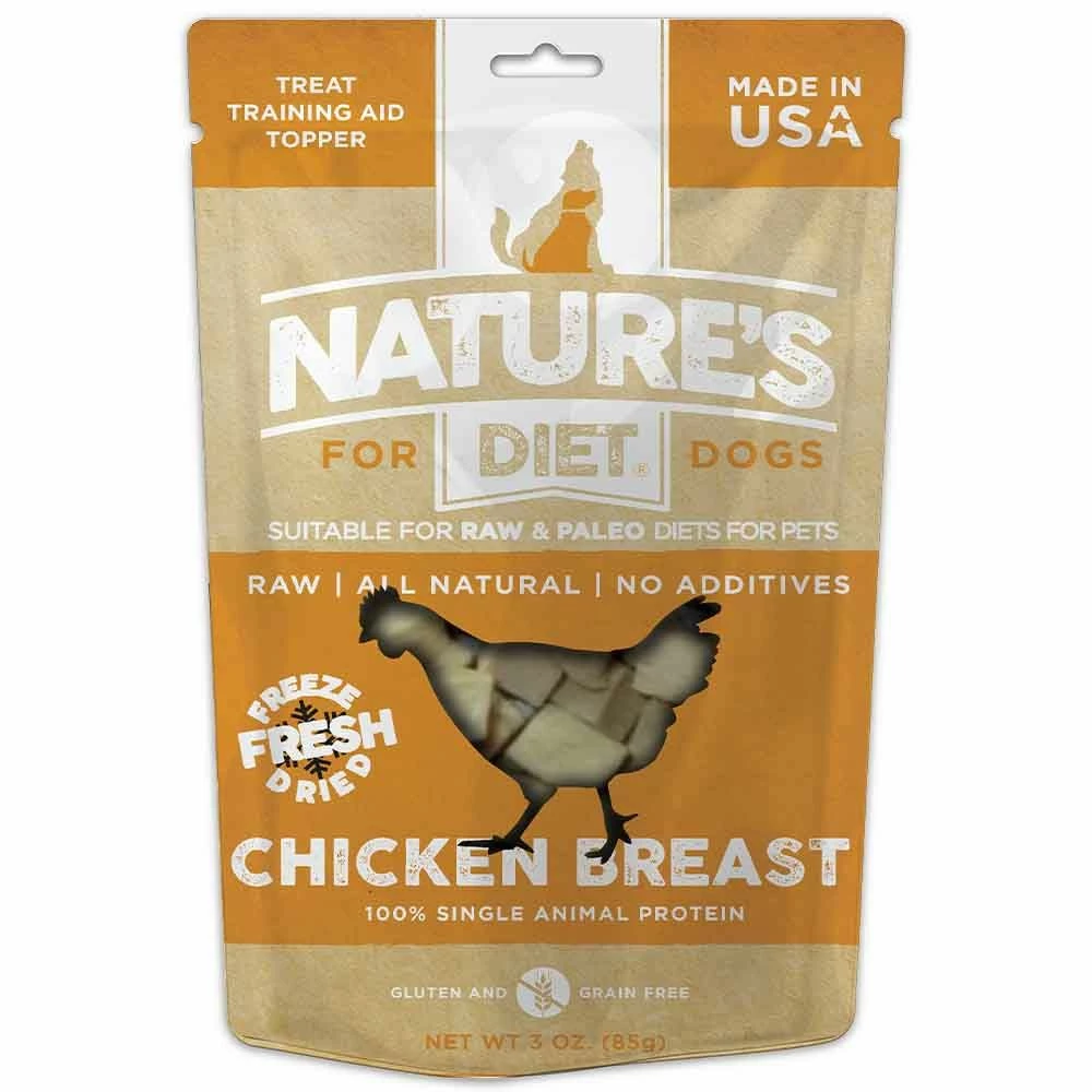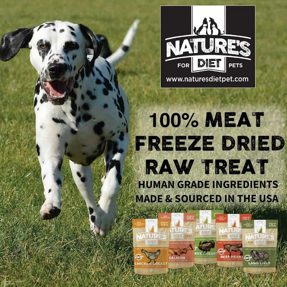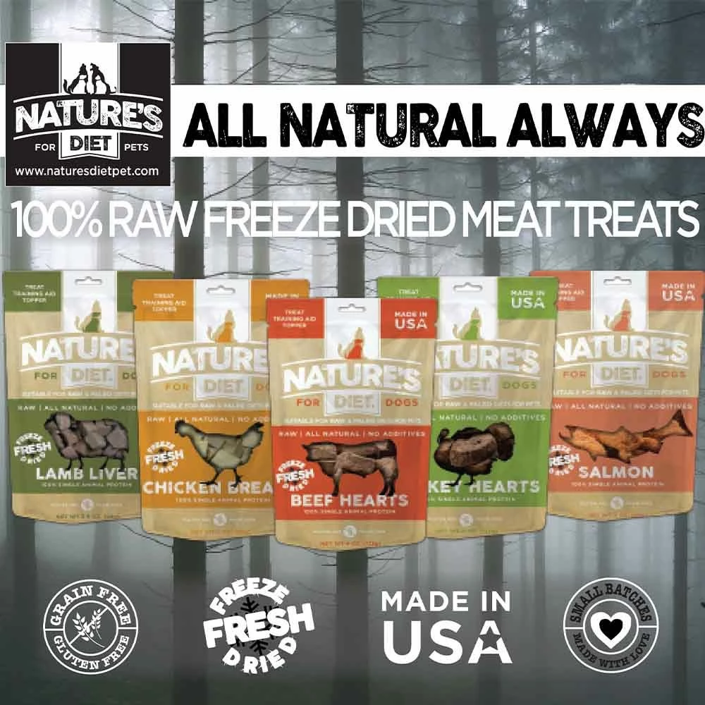 Nature’s Diet Freeze Dried Treats are bite sized pieces of 100% raw meat that are safe to feed and store unrefrigerated. Nature’s Diet uses a cutting edge freeze drying process that eliminates any spoilage concerns while retaining all the nutrition and taste of fresh raw meat. Freeze-Dried fresh is the safest way to feed your pet raw meat. Freeze-drying is a natural, ancient and effective food preservation technique which preserves 98% of nutrition while removing moisture. Every Nature’s Diet freeze-dried raw meat product is guaranteed safe to handle, shelf stable, free of pathogens & easy to store. Your pet will love every protein packed morsel and you can feed with confidence that Nature's Diet all natural, freeze dried treats contain no additives, preservatives, fillers, gluten or grain. Nature's Diet Single Animal Protein Treats are suitable for RAW and PALEO diets and make a perfect pure meat reward, training aid and meal topper. Made lovingly in small batches in the USA.
