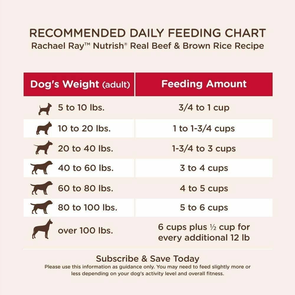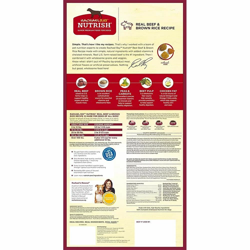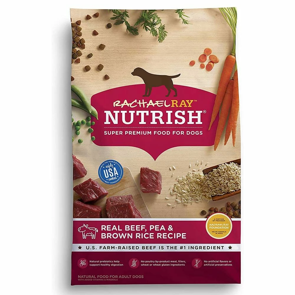 Rachael Ray Nutrish Beef & Brown Recipe Dog Food is made with simple, natural ingredients and added vitamins & minerals. Real Farm-raised beef is always the number one ingredient. And there are no corn, wheat or soy ingredients. You’ll also see added in real pieces of slow roasted chicken, carrots, peas, and apples for a whole taste your dog will love.