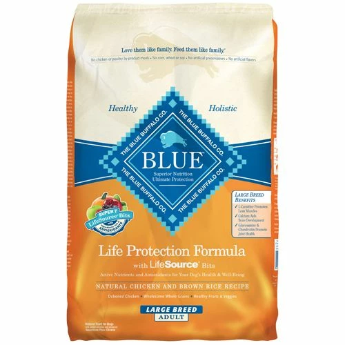 Blue Buffalo Life Protection Formula Chicken and Brown Rice Recipe Large Breed Adult Dog Food is formulated for the health and well-being of dogs. BLUE Life Protection Formula is made with only the finest natural ingredients. This dog food features delicious, protein-rich, Deboned Chicken, Wholesome whole grains, garden veggies and fruit, NO chicken (or poultry) by-product meals, NO corn, wheat or soy, and NO artificial colors, flavors or preservatives. BLUE Life Protection Formula for Large Breed Dogs contains glucosamine and chondroitin to help support the special needs of bigger dogs. LifeSource Bits contain a precise blend of vitamins, minerals and antioxidants selected by holistic veterinarians and animal nutritionists. And now all BLUE Life Protection Formula dog foods feature LifeSource Bits that have been enhanced with the Super 7 package of antioxidant-rich ingredients: apples, blackberries, blue berries, cranberries pomegranate, pumpkin, and spinach. The ingredients in LifeSource Bits help support: Immune system health, Life stage requirements, and healthy oxidative balance. Glucosamine and Chondroitin help support healthy joint function and overall mobility. High-quality protein from Deboned Chicken and Chicken Meal, plus L-Carnitine help develop and maintain lean muscles. Essential proteins and carbohydrates to help meet energy requirements for a healthy lifestyle. A precise blend of Calcium, Phosphorus and essential vitamins helps promote strong bones and teeth. An optimal balance of Omega 3 & 6 Fatty Acids helps to promote a shiny coat and healthy skin. Essential vitamins, chelated minerals and important antioxidants help support the immune system.