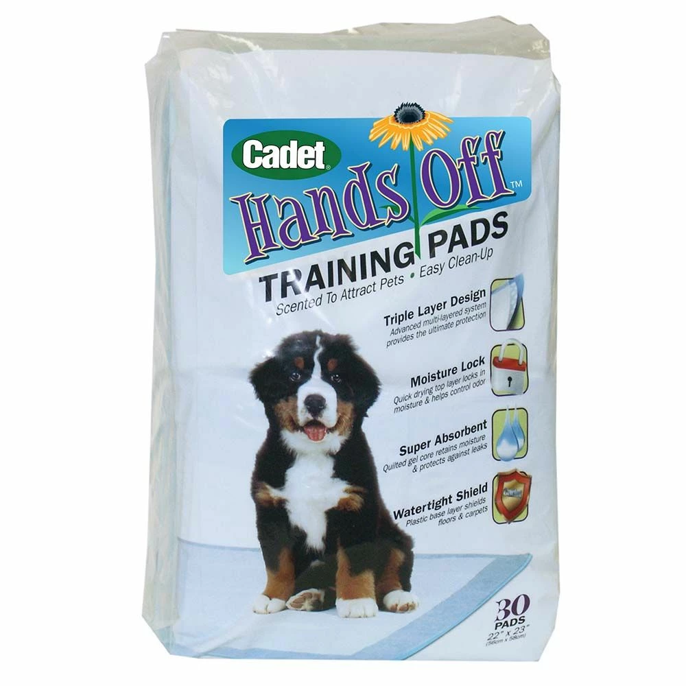 Cadet Hands Off Training Pads have a triple layer design and a watertight base layer to protect the floors and carpets. They have a moisture lock that rapidly dries the top layer while trapping in moisture to help reduce and eliminate odors.