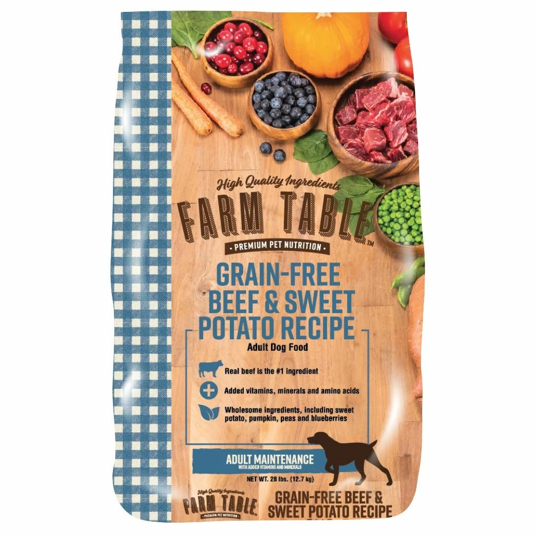 Farm Table® Grain Free Beef & Sweet Potato Recipe Adult Dog Food contains wholesome ingredients, including sweet potato, pumpkin, peas and blueberries. Real beef is the number one ingredient. High-quality protein for strong muscles and great body condition. The right balance of protein & fat to keep your dog at a healthy weight. Moderate levels of fat to help sustain his energy.