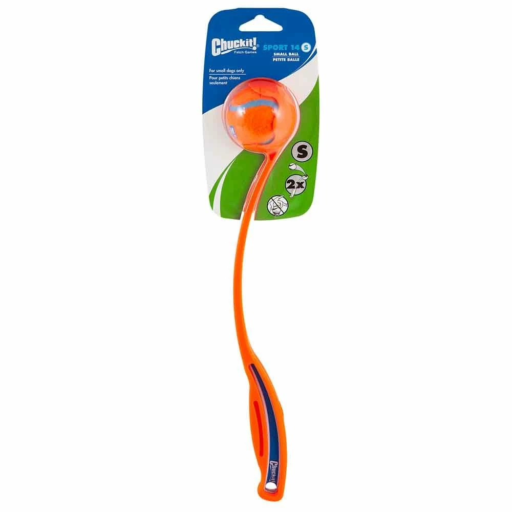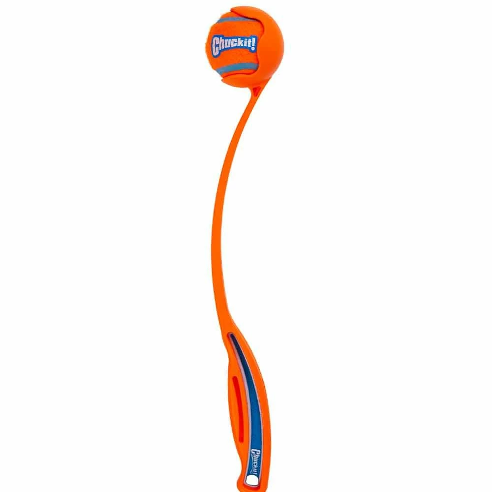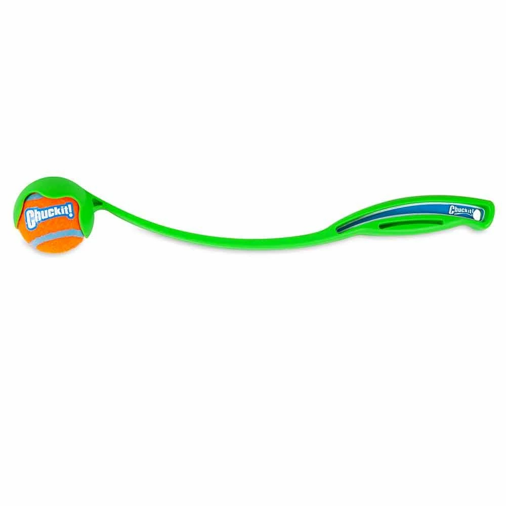 A terrific way to exercise your dog without wearing yourself out is with the Chuckit!® Sport Launcher! Throw balls 2 to 3 times farther with this Ball Launcher. Hands-free pickup – no more slobbery balls. Ergonomic rubber handle for the ultimate comfort and control. Made from durable lightweight flexible plastic. Comes in a variety of throwing ranges and ball sizes. Use with standard tennis balls or Chuckit!® Compatible balls only. Each Launcher comes with a standard Chuckit! Tennis Ball. Ships in assorted colors. Made in the USA.