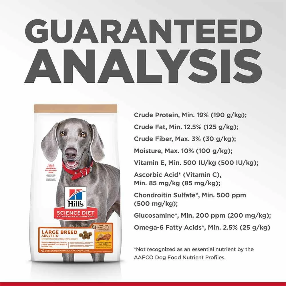 Hill's Science Diet Large Breed Adult No Corn, Wheat, Soy dry dog food is specially formulated to fuel the energy needs of large breed dogs during the prime of their life. This large breed adult dog food is made with high quality, easy to digest ingredients and natural sources of glucosamine and chondroitin for joint health. Balanced nutrition is for holistic health including added taurine. Omega-6s and Vitamin E provides beautiful skin and coat. The high-quality protein for lean muscles. Recommended for large breed adult dogs 1-5 years of age with an ideal weight of 55-110 lbs. and giant breeds 1-4 years of age with an ideal weight of 110+ lbs. Not recommended for large breed puppies, pregnant or nursing dogs.
