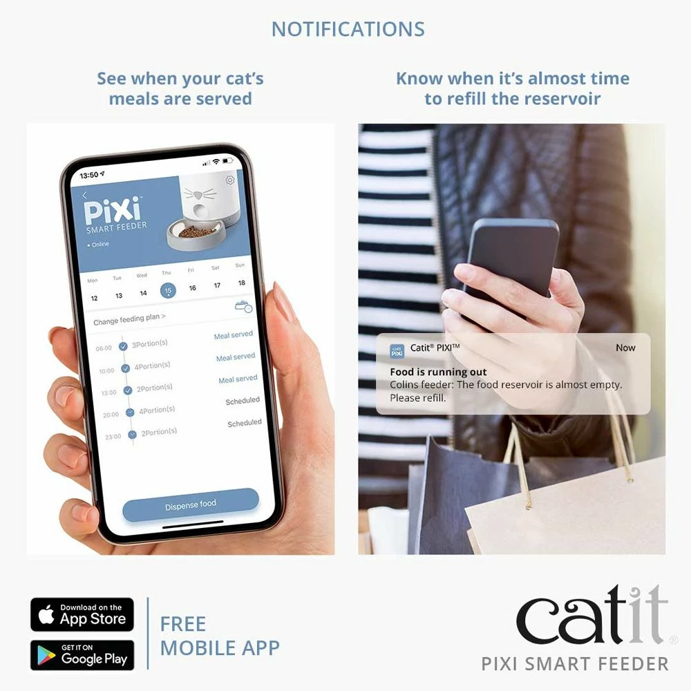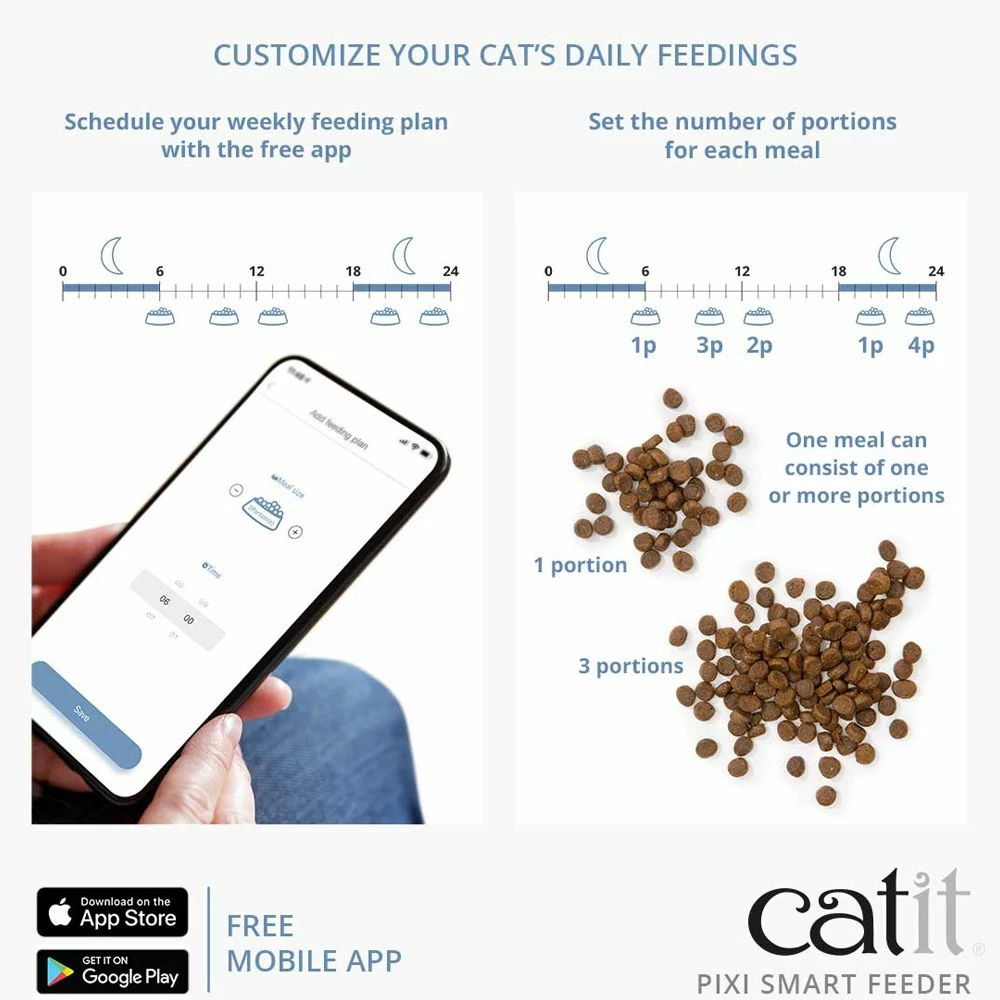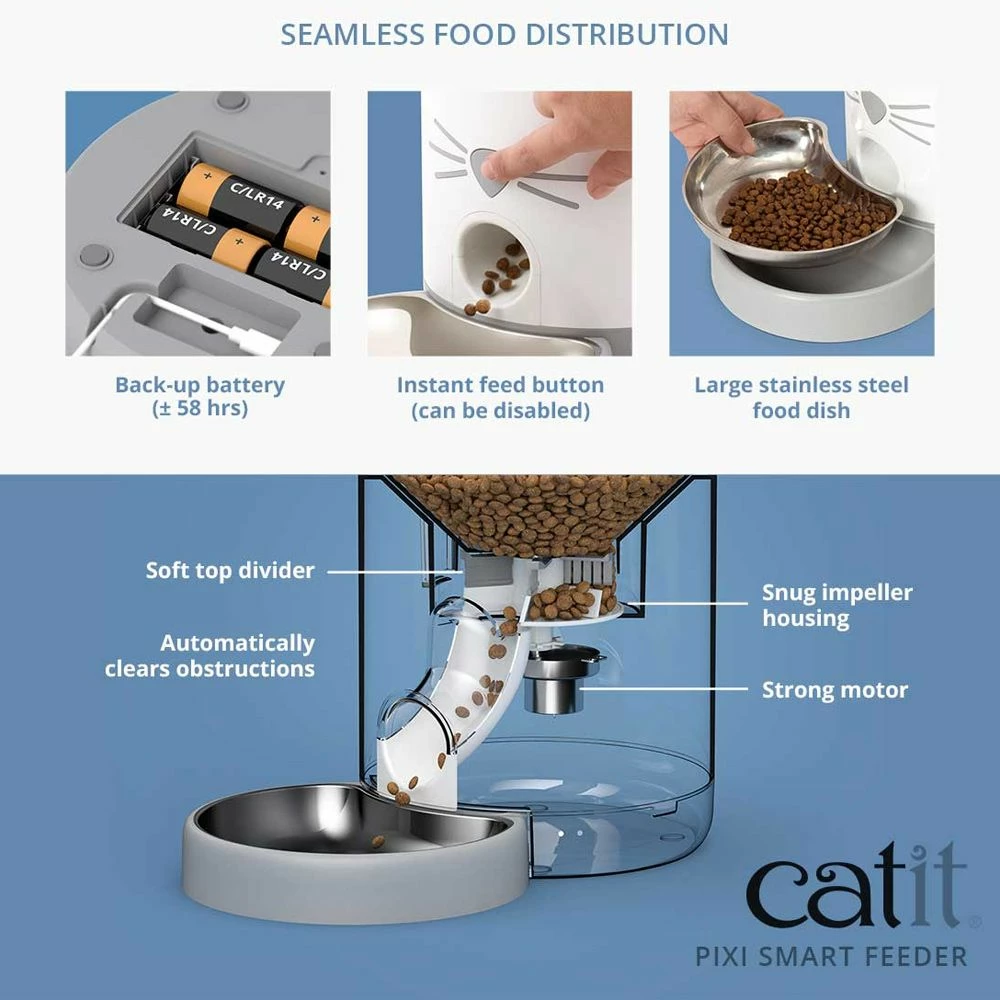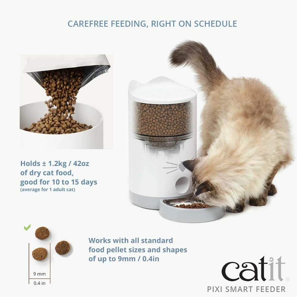 Tired of your cat’s feeding routine? The Catit Pixi Smart Feeder will serve your cat the right amount of food, at exactly the right time. Even when you’re not at home or prefer to stay in bed just a little longer. You can program your cat's feedings according to their schedule which helps prevent binge eating with portion control and instant feed options. Smart Feeder can be controlled via Wi-Fi with free mobile PIXI app. Stainless steel dish reduces stress on whiskers.
