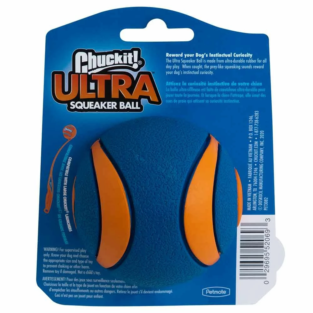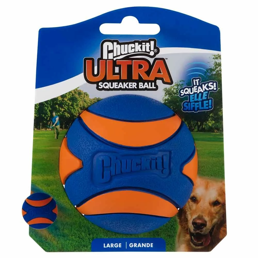 A Chuckit!® Ultra Squeaker Ball is sure to make playtime more enjoyable for you and your pet! This first-ever squeaker ball from Chuckit! entices play with fun sounds and high bounce. The textured surface helps your dog to get a secure grip and the durable rubber construction is easy to clean. Great for dogs who also love to play in the water, the highly buoyant design floats on the water making it perfect for the pool or lake. The Ultra Squeaker Ball is launcher compatible for use with Chuckit! Launchers and offers a new spin on the Ultra Ball® – your dog's favorite! Modeled in squeaker for improved safety. Available in four sizes-small, medium, large, and extra-large.