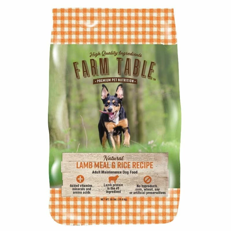 Farm Table® Natural Lamb Meal & Rice Recipe Adult Maintenance Dog Food contains no by-products, corn, wheat, soy or artificial preservatives. Lamb protein is the number one ingredient. Balanced omega 6 and omega 3 fatty acids for healthy skin and coat. Natural prebiotics to help maintain a healthy immune system. High-quality protein for strong muscles and great body condition. The right balance of portion & fat to keep your dog at a healthy weight. Moderate levels of fat to help sustain his energy. With added vitamins, minerals and amino acids.