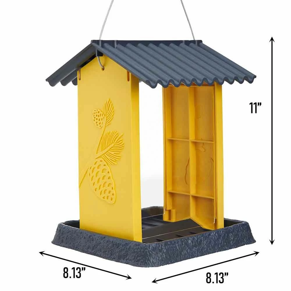 The Yellow Pinecone Hopper Style birdfeeder is part of an extensive Village Collection of feeders. This hanging hopper birdfeeder is crafted out of lightweight plastic for strength and durability. Measuring 8.13 x 8.13 x 11 inches high, this feeder holds 4.25 lbs. of your favorite seed. For monitoring seed levels, the center chamber has two clear window panes. To fill the feeder, simply lift up the roof. This birdfeeder displays a nature-inspired pinecone design on the raised wood-like yellow side panels adding to the whimsical charm of the feeder.