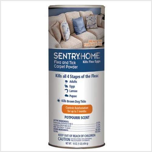 Sentry Home Flea and Tick Carpet Powder 16 Oz. kills all four life stages of the flea: adults, eggs, larvae and pupae. It also kills brown dog ticks. This powder breaks the flea life cycle and controls reinfestation for up to seven months. Protect your pet, your home and your family from the biting, itching and diseases that fleas and ticks can transmit.