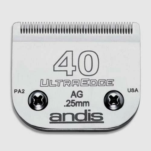 Andis UltraEdge™ Clipper Blade size 40 is a chrome-plated, carbon-edged blade set for Andis detachable blade clippers. This blades is used as a close cutting surgical blade for vets and for grooming poodles face, feet and tail for show. It can also be used with other brands of detachable type clippers. Andis' universal attachment combs (items #12990 and 12860) will fit this blade set. Leaves hair 1/100 in. (0.25 mm). MBG-2 20910, MBG2 20995, MBG-2 21420, AG 21465, MBG2 21485, AG 21730, AG2 22215, AG2 22235, AGC2 22330, AGC2 22340, AGC 22345, AGC 22350, AGC2 22360, AGC2 22405, AGC2 22440, AGC2 22445, AGC2 22465, AGC 22545, AGC2 23085, AGC2 23090, AGCL 23170, AGCL 23175, AGCL 23225, AGP 27370, AGP 27435, AGP 27640, SMC 63205, AGRV 63360, AGRC 63785, AGR+ 63855, AGRC 63970, AGC2 64575, AGRC 64770, AGR+ 64800, AGR+ 65340, SMC 65410