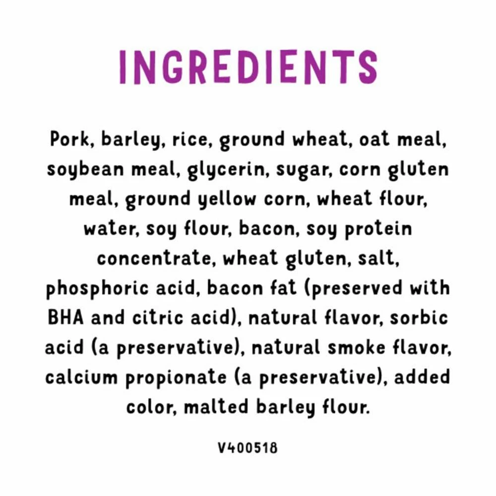 | Ingredients | Pork, barley, rice, ground wheat, oat meal, soybean meal, glycerin, sugar, corn gluten meal, ground yellow corn, wheat flour, water, soy flour, bacon, soy protein concentrate, wheat gluten, salt, phosphoric acid, bacon fat (preserved with BHA and citric acid), natural flavor, sorbic acid (a preservative), natural smoke flavor, calcium propionate (a preservative), added color, malted barley flour. |