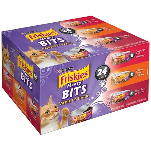 Friskies® Meaty Bits Cat Food Variety Pack provides 100% complete and balanced nutrition. These meaty bits provide taste adventures that feed a cat's playfulness and curiosity with a variety of meaty flavors.