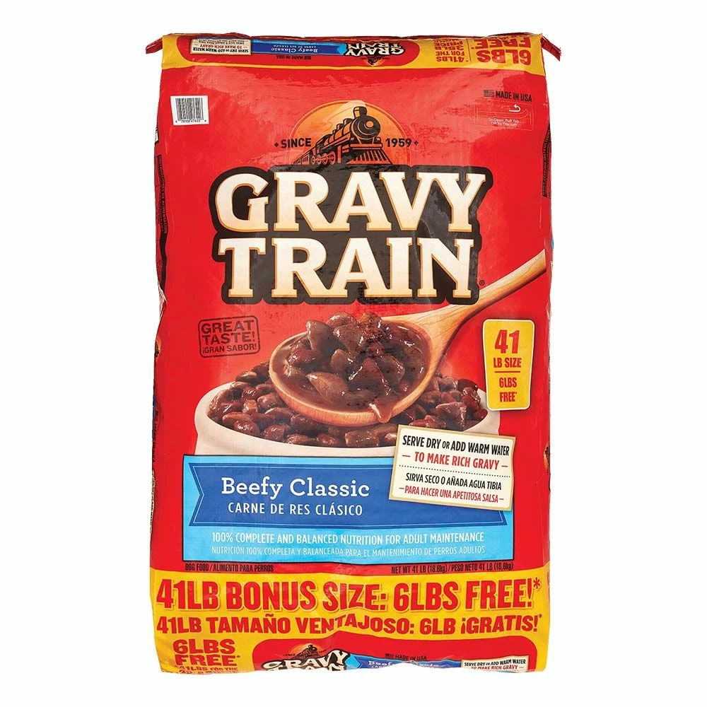 Gravy Train® Beefy Classic dry dog food has a meaty aroma and taste that dogs get excited about! Serve it up as a deliciously crunchy kibble or stir in warm water to create rich savory gravy.