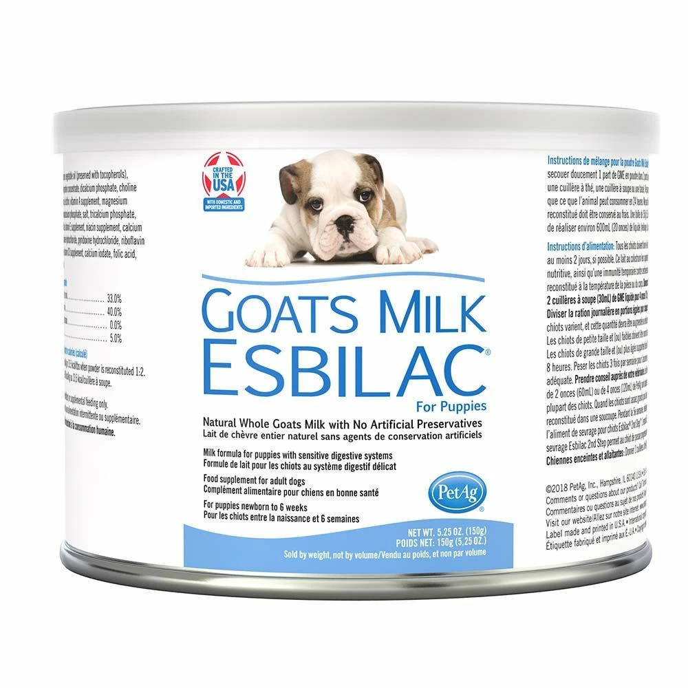 Scientifically formulated Goats Milk Esbilac® is made with whole goats milk protein for puppies with sensitive digestive systems. It provides puppies with advanced nutrition that is easy-to-digest and closely matches mother's milk in protein, fat and carbohydrates. Goats Milk Esbilac is also fortified with vitamins, minerals and essential amino acids to assure proper nutrient absorption. The powder formula is especially beneficial for developing digestive systems, because it contains both prebiotics plus probiotics – a source of live, naturally occurring microorganisms. Make sure your puppy grows up healthy, vital and strong with Esbilac – the #1 selling puppy milk replacer from PetAg®.