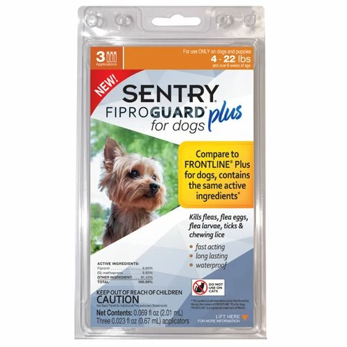 SENTRY® Fiproguard® Plus Topical Flea and Tick Treatment for Dogs contains fipronil, and (s)-methoprene to protect against fleas, flea eggs, flea larvae, ticks and chewing lice. This fast-acting and long-lasting squeeze-on breaks the flea life cycle by killing flea eggs and larvae. It also helps to protect your pets and family from illness by killing ticks that may transmit Lyme disease. It kills fleas, flea eggs, flea larvae, ticks and chewing lice for up to 30 days. Fiproguard® Plus stops the flea life cycle and kills flea eggs and larvae for up to 12 weeks. It is waterproof. For use on dogs 12 weeks of age and over.
