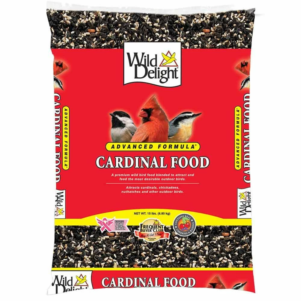 Wild Delight Cardinal Wild Bird Food is premium wild bird food blended to attract and feed the most desirable outdoor pets. It attracts Cardinals, Songbirds, Titmice, Grosbeaks, Thrushes, Jays and other outdoor pets. It features real cherries, real nuts, added vitamins, added minerals, electrolytes, amino acids, no corn, no milo, no millet, and no chemical preservatives. It is ideal for tube feeders with large holes, hopper feeders, platform feeders or on the ground.