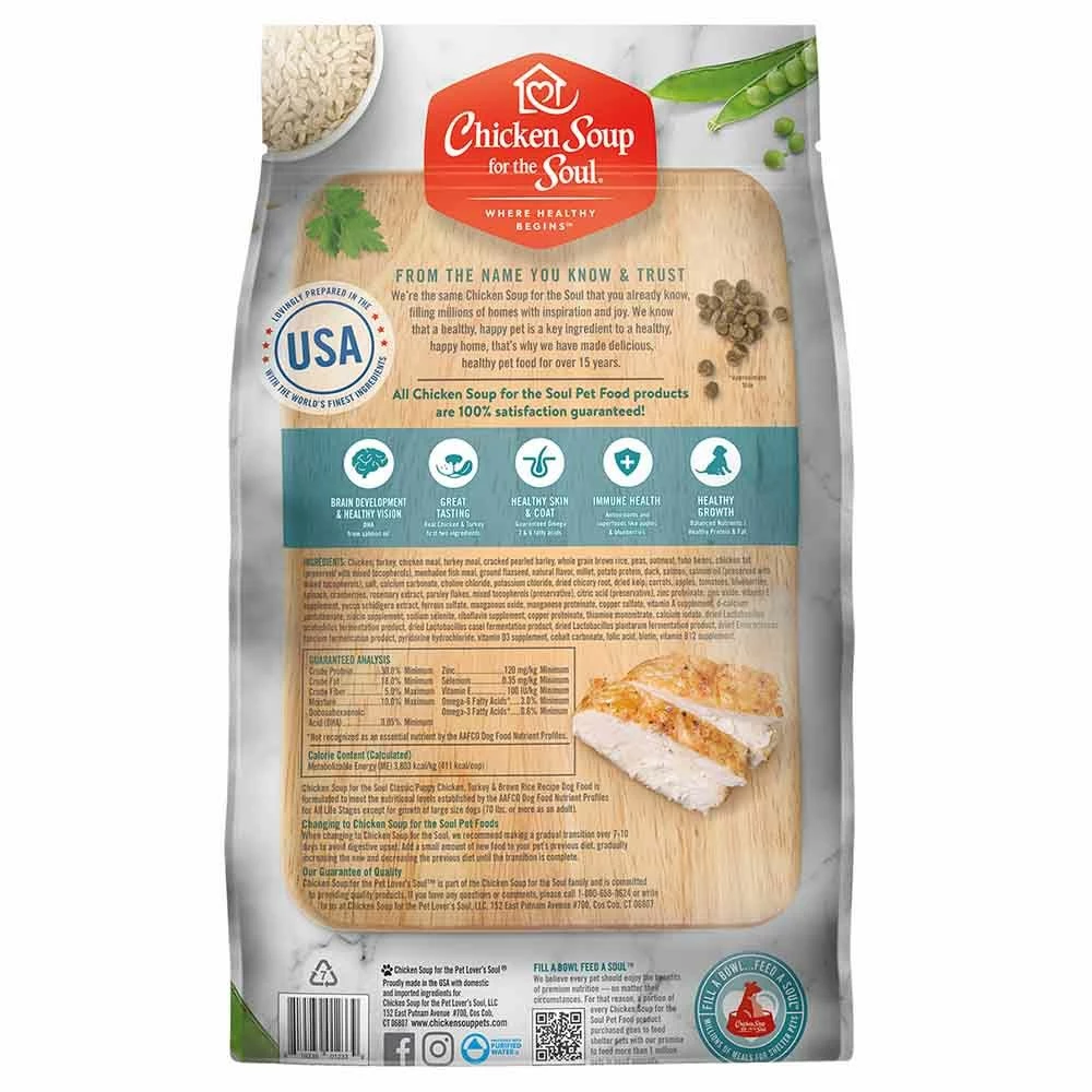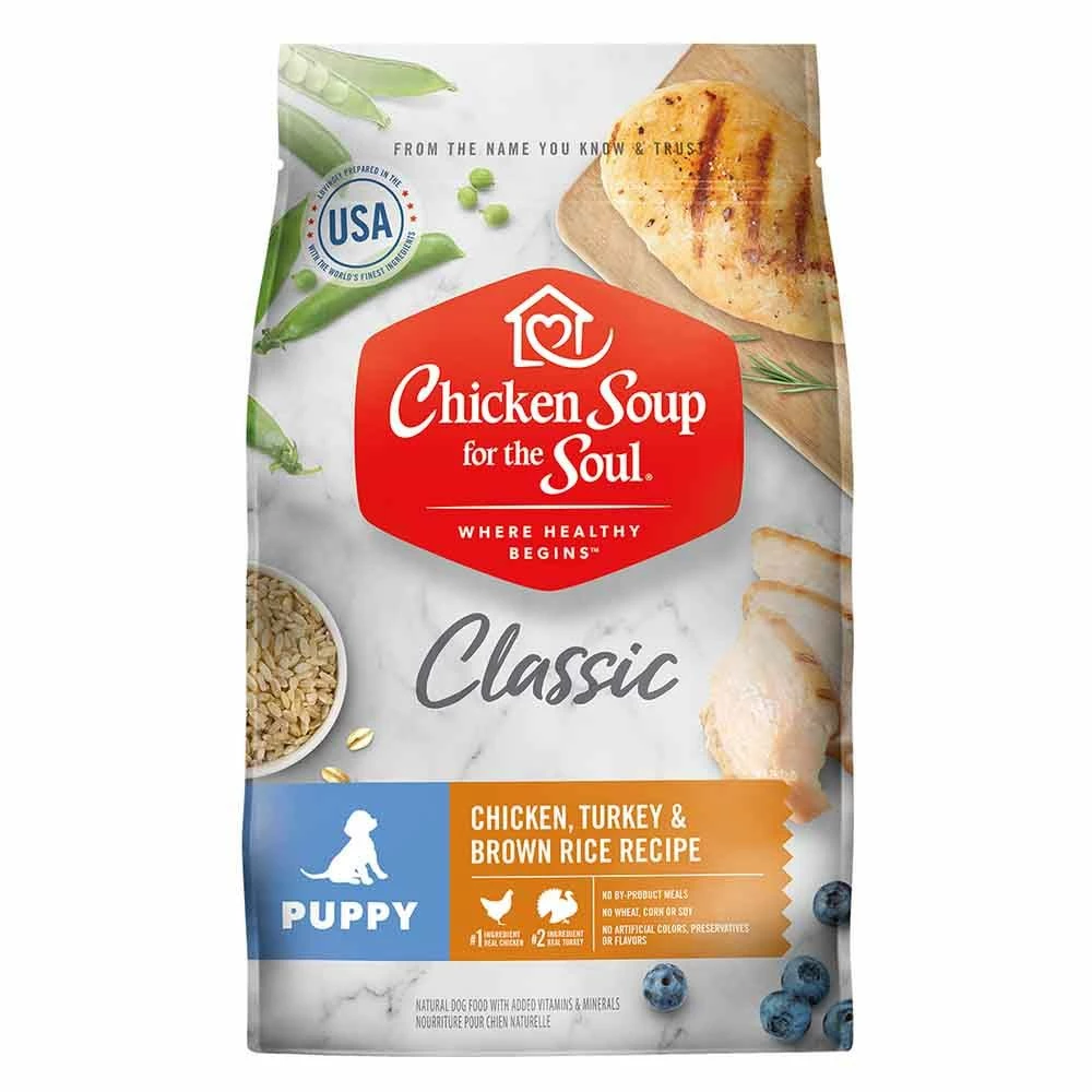 Chicken Soup for the Soul Classic Puppy Dry Dog Food Chicken, Turkey & Brown Rice Recipe features real chicken as the #1 ingredient and real turkey as the #2 ingredients. Classic Puppy Dry Dog Food Chicken, Turkey & Brown Rice Recipe is made with out by-product meals, wheat, corn, soy, artificial colors, preservatives or flavors. The balanced nutrients and healthy protein and fat allow your puppy healthy growth. It is lovingly prepared in the USA with the world's finest ingredients. Omega 3 and 6 fatty acids provide a healthy skin and coat. The antioxidants and superfood like apples and blueberries support immune health. DHA from salmon oil provides nutrients for brain development and healthy vision.