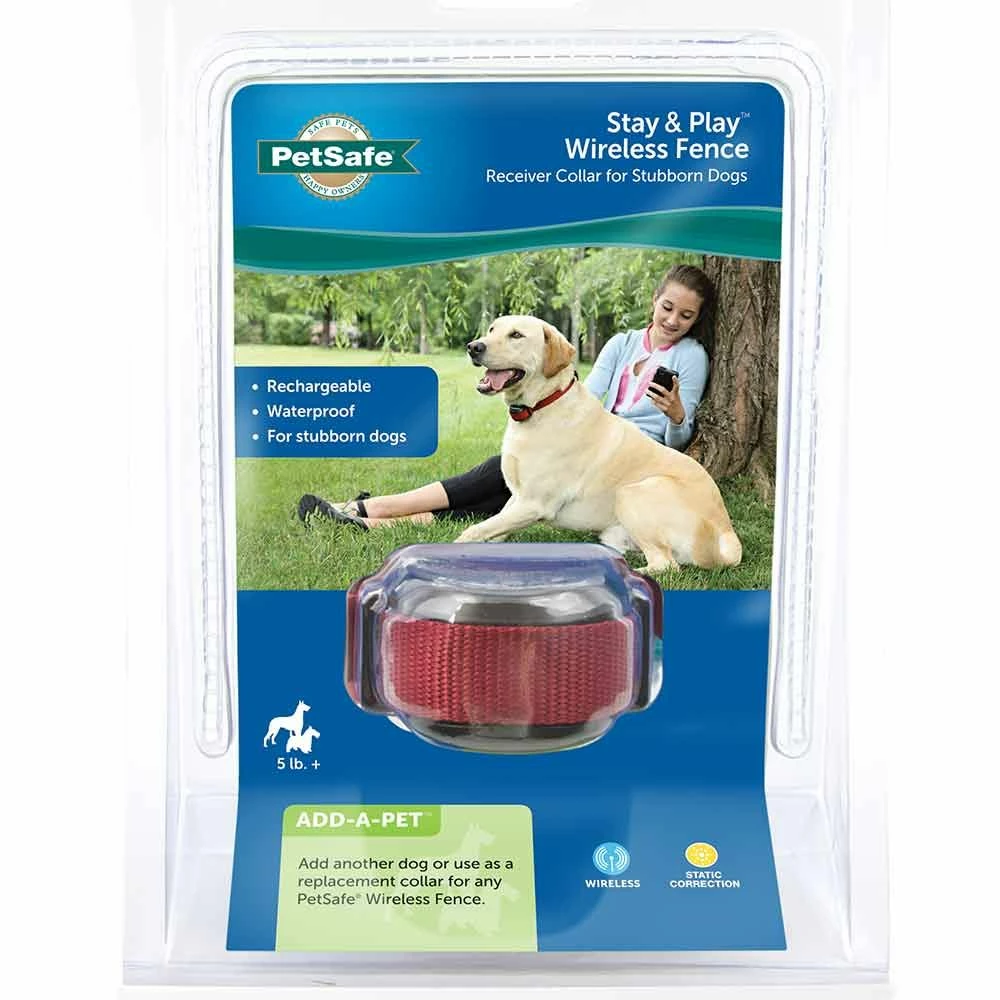 The Stubborn Dog Stay + Play Wireless Fence® Receiver Collar is designed for stubborn or hard-to-train dogs that require a higher level of intensity. It can be used to add another dog or as a replacement collar for the Stay + Play Wireless Fence® or the PetSafe® ® Wireless Pet Containment System. This rechargeable collar features 5 levels of static correction plus a tone-only mode for training.