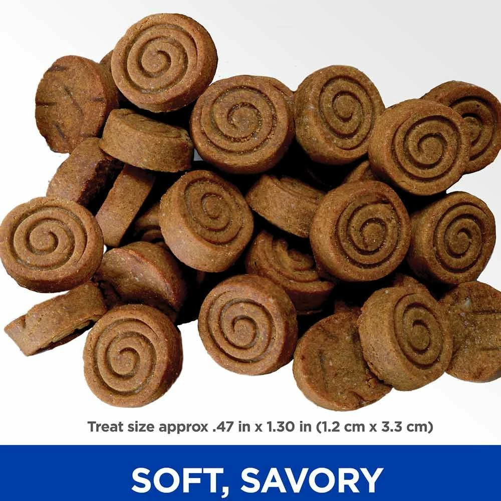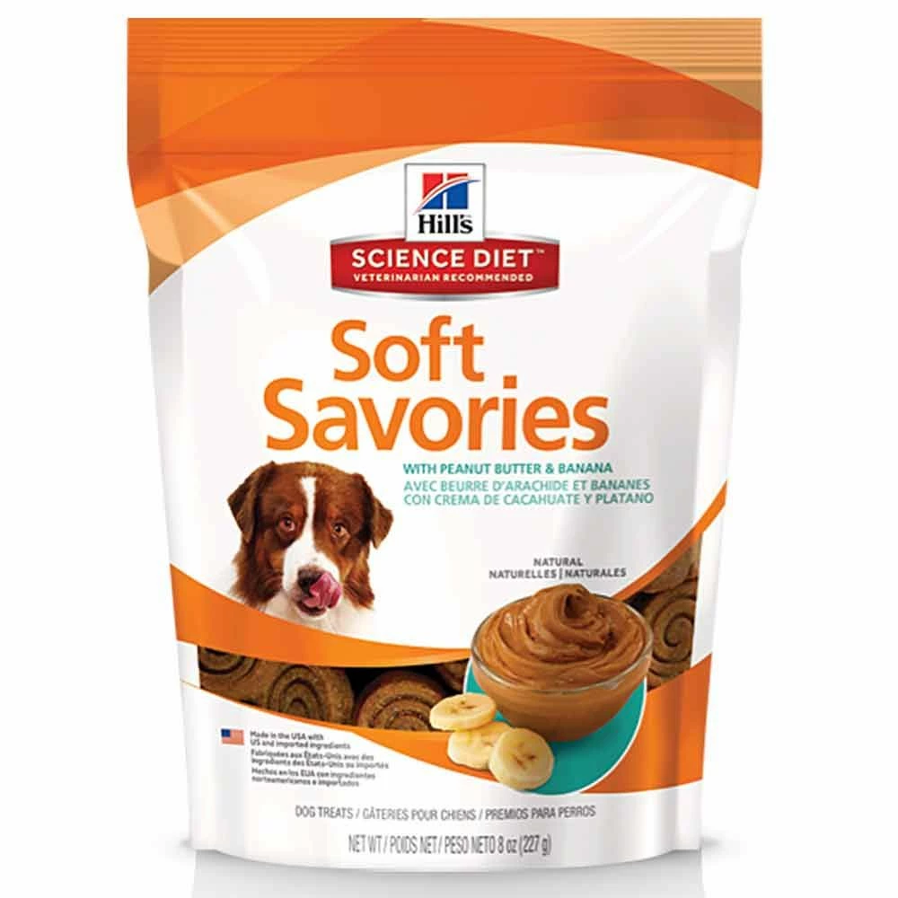 Hill's® Science Diet Natural Soft Savories with Peanut Butter & Banana dog treats are delicious, natural and made from only the best ingredients. The soft and tender texture paired with a medley of fun rich flavors will make a dog happy. Not artificially preserved or flavored. Feed as a snack as part of a feeding routine with Hill's dry and canned foods for healthy dogs. Recommended for normally active puppy (9+ weeks old), adult and mature adult dogs.
