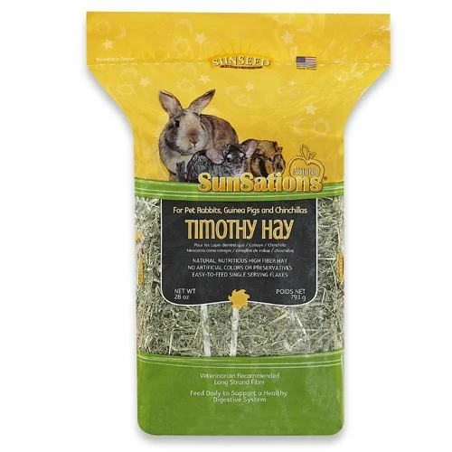 Sunseed SunSations® Natural Timothy Hay is a 100% North American grown, carefully selected, premium grade hay. It encourages healthy chewing and consists of nutrient rich, long strand fiber hay, which is essential to a healthy digestive system. Hay is compressed into mini bales which expand into easy to feed sections called flakes. These flakes expand into generous feeding portions once removed from the mini bale. Mini bales are tightly banded to protect the hay from UV light, keeping it greener and more flavorful. SunSations® Natural Timothy Hay has no artificial colors or preservatives.