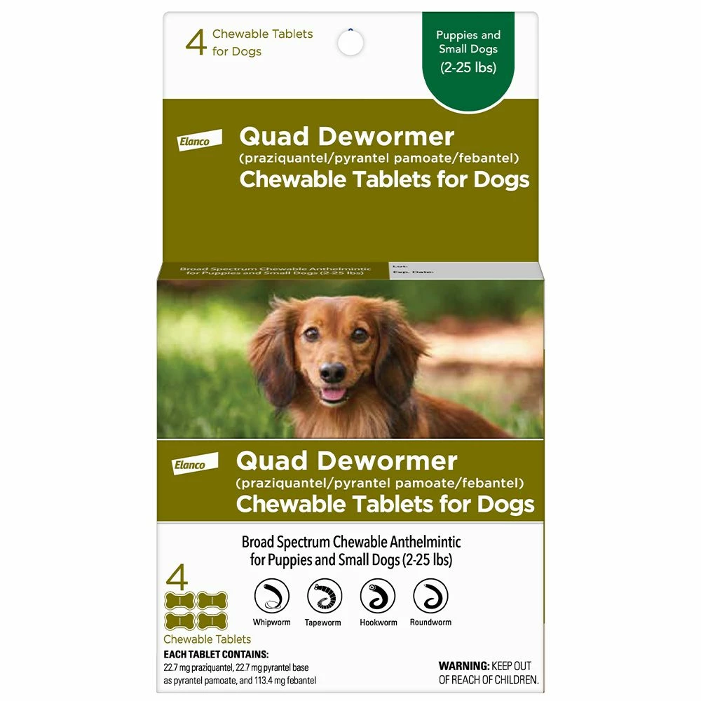 Bayer Quad Dewormer for Dogs is a broad-spectrum dewormer that removes common intestinal parasites with a single dose.* Quad Dewormer is effective against tapeworms, roundworms, hookworms and whipworms. The directions for Quad Dewormer (praziquantel/pyrantel pamoate/febantel) for dogs are simple! Designed to make dosing and administration easy, the chewable, beef-flavored taste tabs are almost like a treat experience for your dog. You can offer the proper dosage directly in your dog’s mouth or in a small amount of food. Fasting is not necessary or recommended. Potential side effects: Isolated incidents of either vomiting, bloody stool or watery/profuse stool have been reported following treatment with Quad Dewormer (praziquantel/pyrantel pamoate/febantel) for dogs. If these signs are observed and they persist, consult your veterinarian. You also might notice worms appearing in your pet’s stool. While this may be alarming, it’s a good thing because it means the medication is flushing the worms out of the dog. Make sure to always pick up pet waste, using gloves and washing hands after. Do not use in pregnant animals. Consult your veterinarian for assistance in the diagnosis, treatment and control of parasitism. Consult your veterinarian before administering the tablets to weak or debilitated animals. Do not deworm a dog or puppy that is sick. Consult your veterinarian for diagnosis of the illness and appropriate care. *Steps should be taken to control fleas and rodents on the premises in order to prevent reinfection; otherwise, re-treatment will be necessary. Consult your veterinarian for assistance in the diagnosis, treatment and control of parasitism.