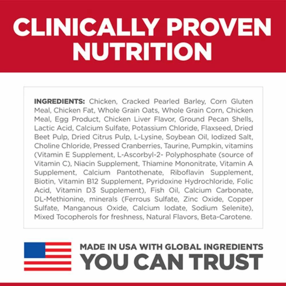 | Ingredients | Chicken, Cracked Pearled Barley, Corn Gluten Meal, Chicken Fat, Whole Grain Oats, Whole Grain Corn, Chicken Meal, Egg Product, Chicken Liver Flavor, Ground Pecan Shells, Lactic Acid, Calcium Sulfate, Potassium Chloride, Flaxseed, Dried Beet Pulp, Dried Citrus Pulp, L-Lysine, Soybean Oil, Iodized Salt, Choline Chloride, Pressed Cranberries, Taurine, Pumpkin, vitamins (Vitamin E Supplement, L-As corbyl-2-Polyphosphate (source of Vitamin C), Niacin Supplement, Thiamine Mononitrate, Vitamin A Supplement, Calcium Pantothenate, Riboflavin Supplement, Biotin, Vitamin B12 Supplement, Pyridoxine Hydrochloride, Folic Acid, Vitamin D3 Supplement), Fish Oil, Calcium Carbonate, DL-Methionine, minerals (Ferrous Sulfate, Zinc Oxide, Copper Sulfate, Manganous Oxide, Calcium Iodate, Sodium Selenite), Mixed Tocopherols for freshness, Natural Flavors, Beta-Carotene. |
