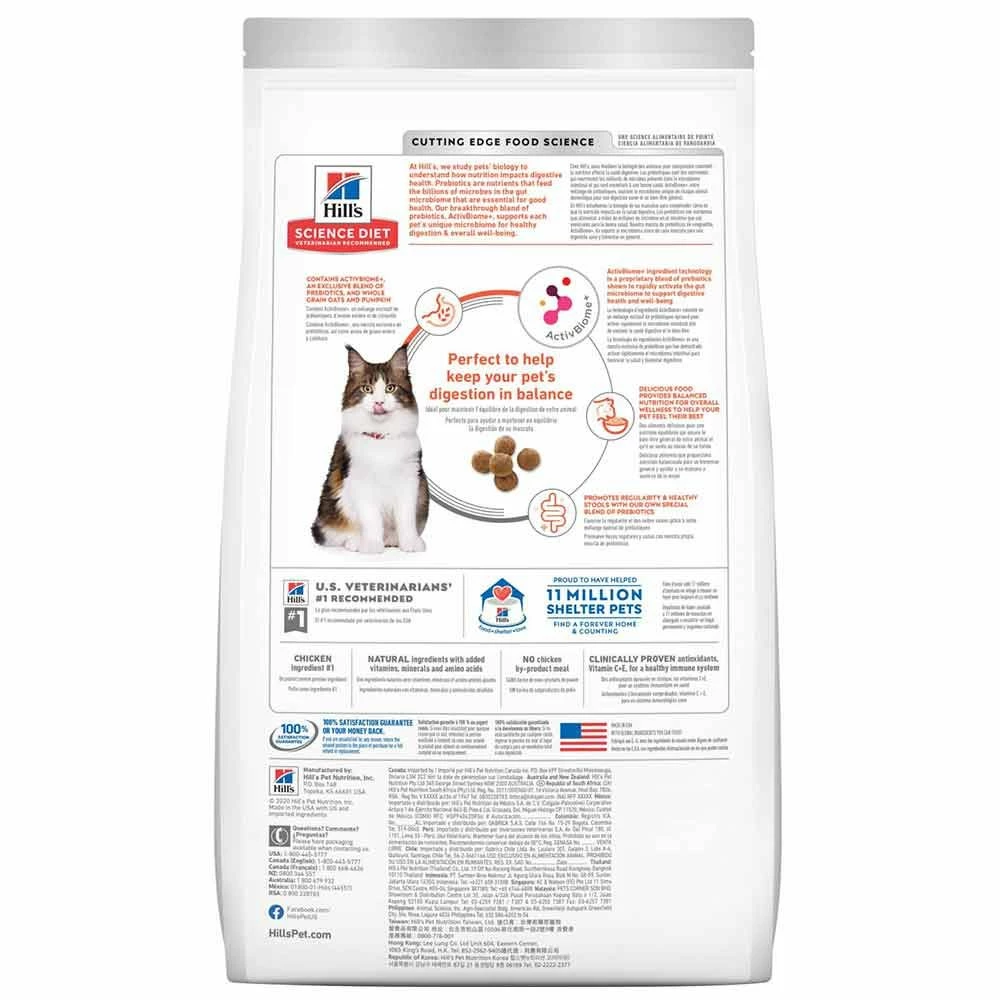 Hill's Science Diet Adult Perfect Digestion Dry Cat Food feature prebiotics that are nutrients that feed the billions of microbes in the gut microbiome that are essential for good health. The breakthrough blend of prebiotics, ActivBiome+ (an exclusive blend of prebiotics, and whole grain oats and pumpkin), supports each pet's unique microbiome for healthy digestion and overall well-being. This delicious food provides balanced nutrition for overall wellness to help your pet feel their best. This food helps your pet's body absorb and use vital nutrients. The high-quality protein helps maintain lean muscles. The essential taurine is for heart health and balanced minerals to support kidneys and bladder. Recommended for adult cats 1-6 years to help keep their digestion in balance. Not recommended for kittens, adult cats ages 7+, pregnant or nursing cats.